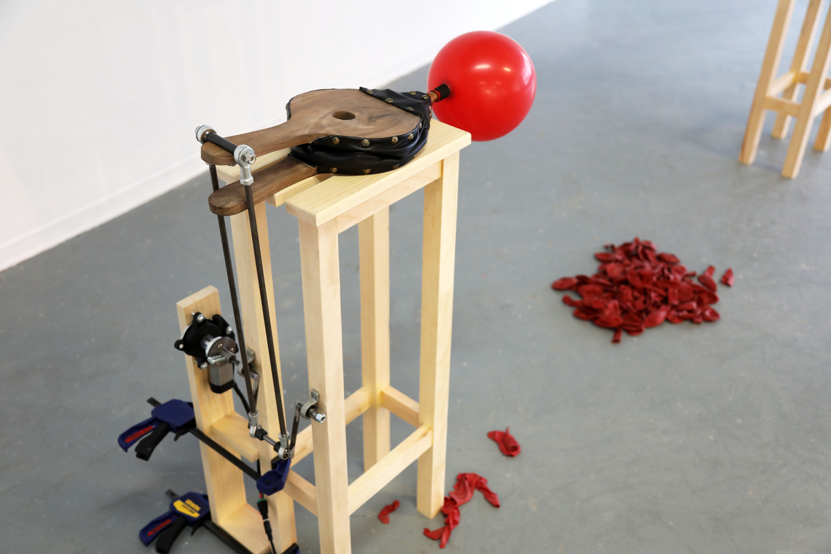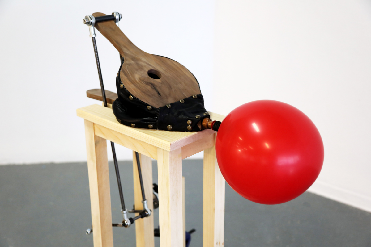 Une métafoire, bois, cuir, moteur, métal, composantes mécaniques et électriques, ballons en latex, 2020