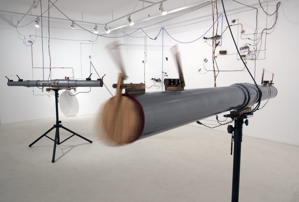 Parmi les oeuvres d'artistes qui informent mon travail se trouve Orchestre à géométrie variable de l’artiste québécois Jean-Pierre Gauthier. Les notions d’ordre et de chaos, de permanence et de fragilité y sont aussi présentes. L’installation s’adapte au lieu selon la grandeur des fils électriques qui demeurent visibles et forment des dessins au mur. Les canons haut-parleur sont bricolés et module la sortie du son tandis que le réseau électronique découle d’un minutieux travail d’ingénieur. Ce côté bricoleur et ce côté ingénieur sont deux approches qui se côtoient dans mon travail également.