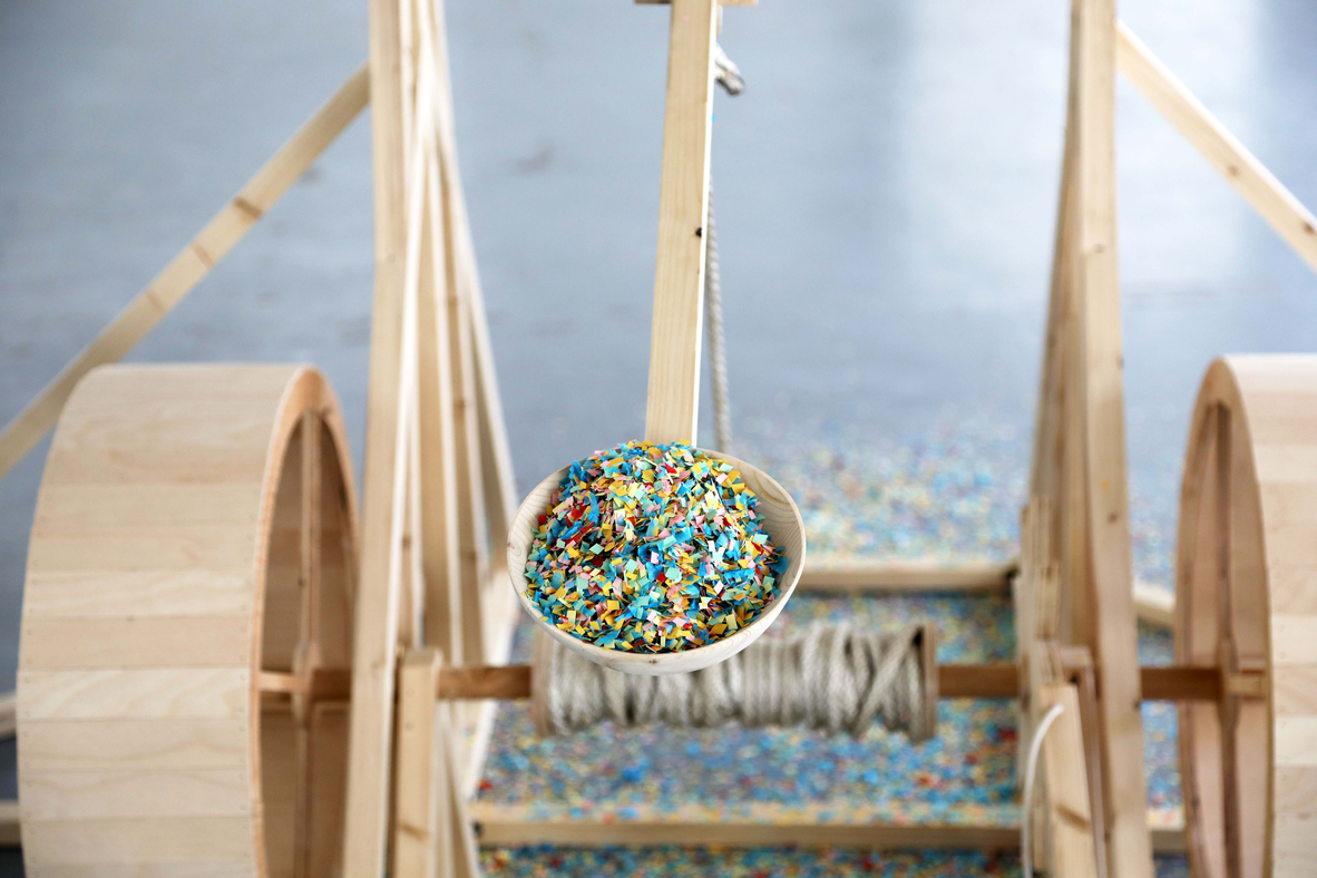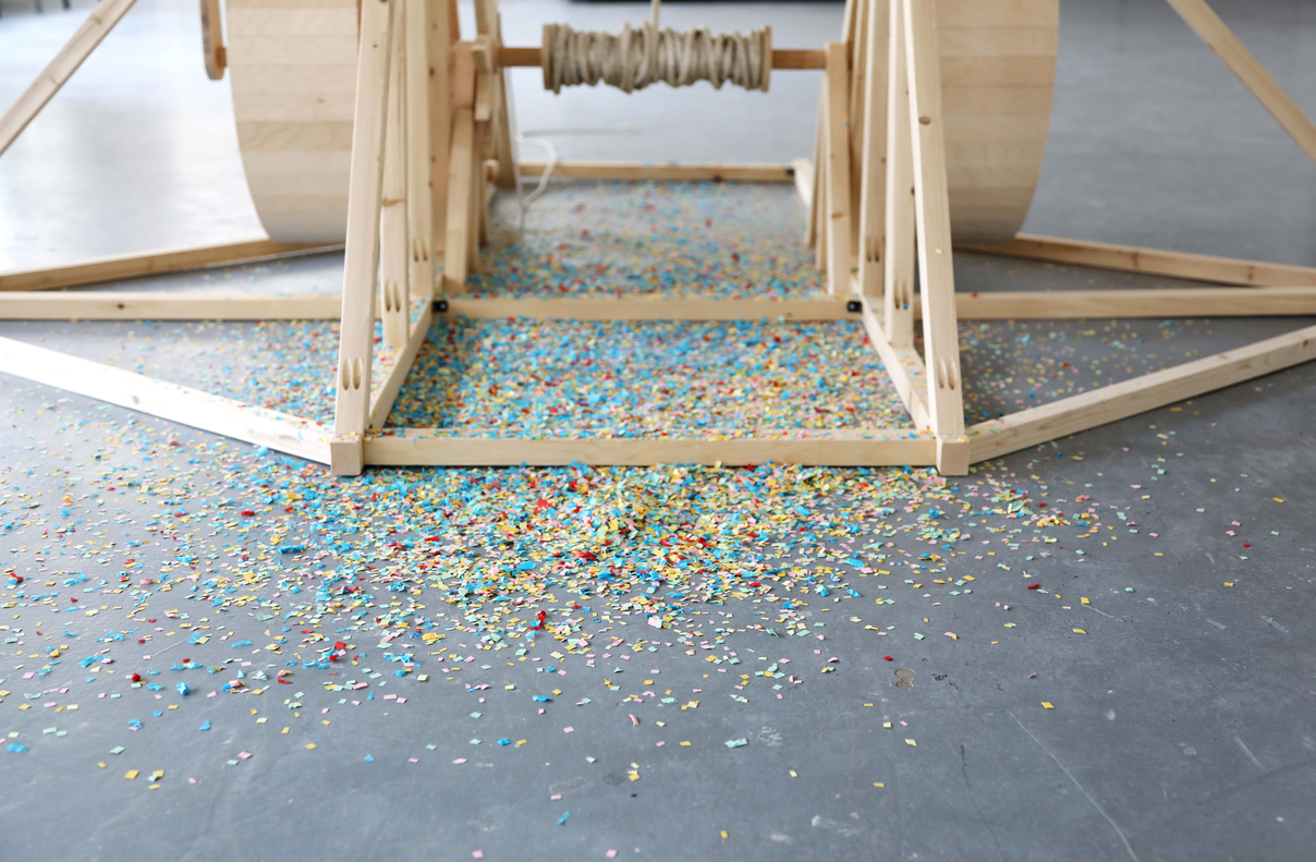 J’explore le mouvement par des mécanismes simples et rudimentaires tels que des arbres à came ou des mécanismes à contrepoids, par exemple. Ceci n'est pas le suicide de ma féminité consiste en un trébuchet-catapulte qui projette des confettis lorsqu'il est actionné. Je me suis intéressée à l’action de lancer puisqu’il s’agit de passer d’un point à un autre. Le mouvement devient un moment dans le temps qui selon Debicki « inspirent un art dynamique, qui intègre le temps comme une ‘’matière’’ sous forme de mouvement et de transformations » (Debicki et al., 1995). Le titre est en référence à mon travail qui est décrit comme étant masculin. Ceci est une réponse aux nombreux commentaires désobligeants d’hommes qui ont voulu, de mauvaise foi ou non, dénigrer mes connaissances ou mes compétences.