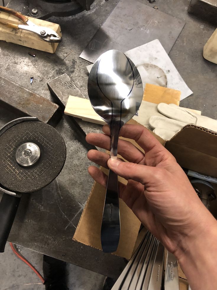 J’ai une tendance naturelle à vouloir fabriquer et apprendre de nouvelles techniques. À mon avis, la proximité avec la matière dans le travail intensifie la sensibilité qui se dégage d’un objet fait main versus un objet manufacturé. Dans l'œuvre À la soupe, les assiettes blanches sont manufacturées, tandis que les cuillères d’acier inoxydable sont modifiées. Pour des raisons de praticabilité, d’esthétique et d’espace, je souhaitais intégrer à mon installation des cuillères à soupe à long manche. Celles-ci étant introuvables, j’ai opté pour la modification de cuillères de service. Étant donné qu’elles sont faites à la main, elles sont légèrement différentes les unes des autres : « ce qui fait la force envoûtante de certaines œuvres c'est secrètement ce léger ratage ». (Grossman, 2017). Par léger ratage, j’entends ces légères dissimilitudes entre les courbes des cuillères ou encore leurs formes. Visuellement, une harmonie s’installe, mais mécaniquement, des différences liées à la transformation manuelle émergent affectant ainsi la sonorité et conférant une individualité à chacune. Il en résulte donc un côté plus organique à la mécanique qui peut sembler très rigide.