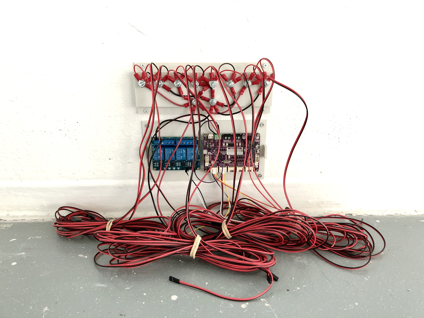 L’image ci-haut représente le cerveau de l’installation. J’utilise un microcontrôleur et un circuit à relais pour démarrer et arrêter l’installation selon une programmation désignée. Les cuillères s’activent pendant une période donnée de quelques secondes, puis se mettent en pause pendant un temps aléatoire de quelques minutes. Le tout s'active de nouveau lorsqu'il y a présence de spectateurs devant l'installation. Je compte utiliser le même principe et poursuivre mes recherches en ce sens pour les autres sculptures qui ne seront donc pas en mouvement constant. Il y aura certainement un désordre ambiant, mais je souhaite une harmonie dans l’ensemble en développant mon projet autour de réflexions portant sur la motivation du passage de l'inaction à l'action.