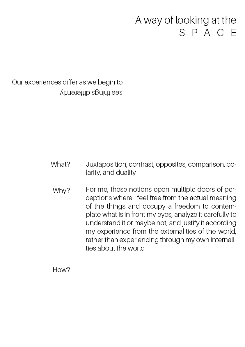 What makes the space captivating? Are we really in control while we are in a certain space or a space is in control? What makes us surrender in a certain space? When do we start thinking from the externalities of the world rather than our own internal perspectives about the world? With my work, I am creating spatial experiences within the realm of juxtaposition which eventually leads to the not knowing. Because it summons us into a larger universe than we can comprehend rationally, and ask us to look at what we do not know, rather than what we do know. If we can do so, we can become more flexible, more open, more willing to live with uncertainty, by willing to question our ordinary assumptions about how the world and we ourselves are.