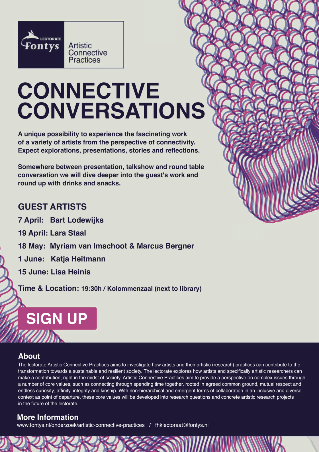 As the series is part of the lectorate, all events and conversations will be thoroughly documented, reflected upon and included in this ongoing Research Catalogue exposition that will cover the entire series and what the various events mean for the concept of Artistic Connective Practices.