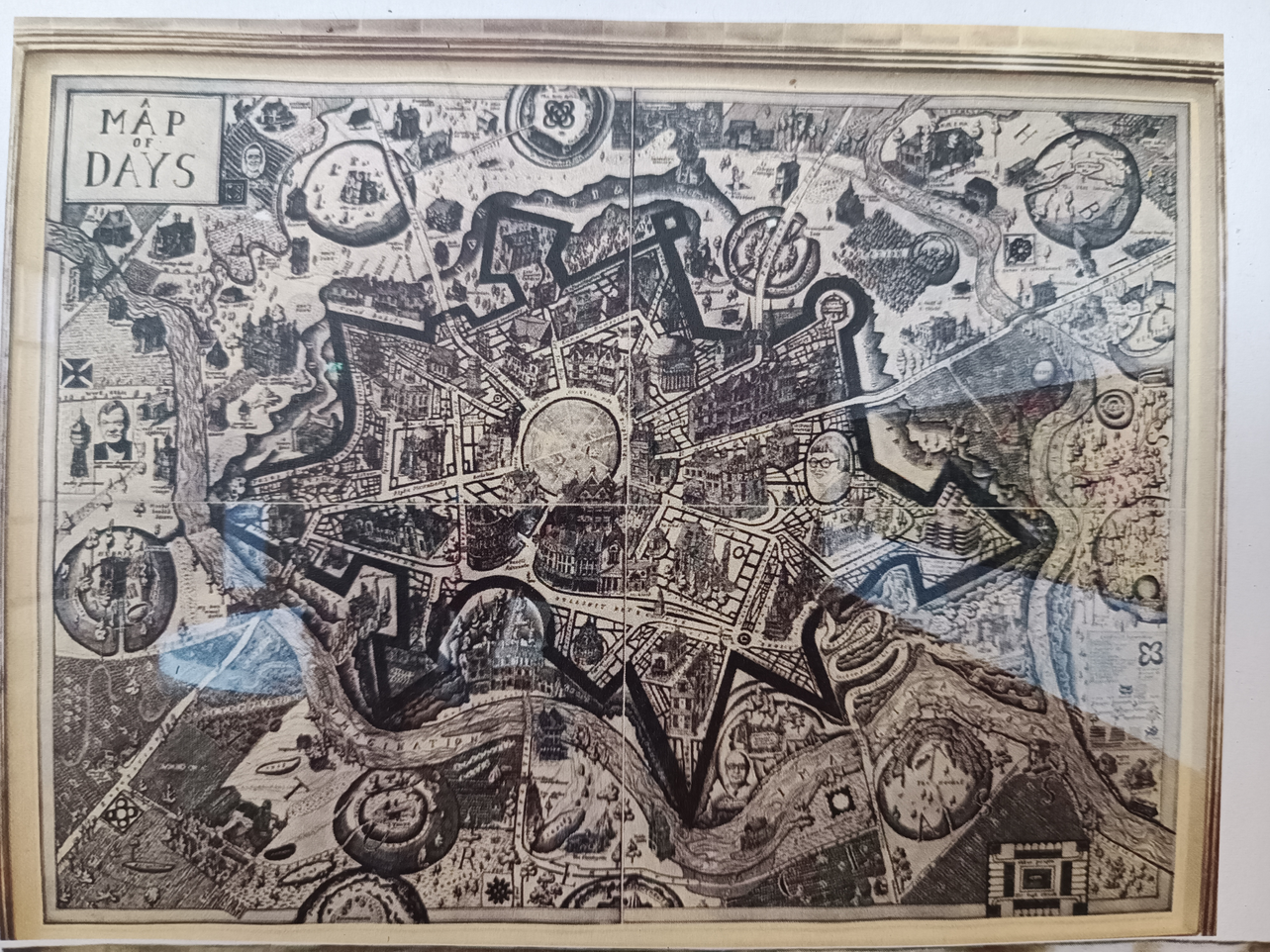 What I like about maps in the context of constellations is that time is crystallized. You can see a whole place - a city or area with towns or villages within it at the same time. In your mind you can travel through it, speeding or slowing time as you look. You get a hypothetical snapshot of a total place's time/ beingness, by seeing it as an entity or sequence of correspondences. There is no linear timeline here apart from one's personal journey through the map. It is a web in itself - a mycellium, an ecosystem. Time is somehow artifically frozen on the paper, the map itself, but the map also exists in the living spatial reality, in those who exercise it in memory when travelling within the area.