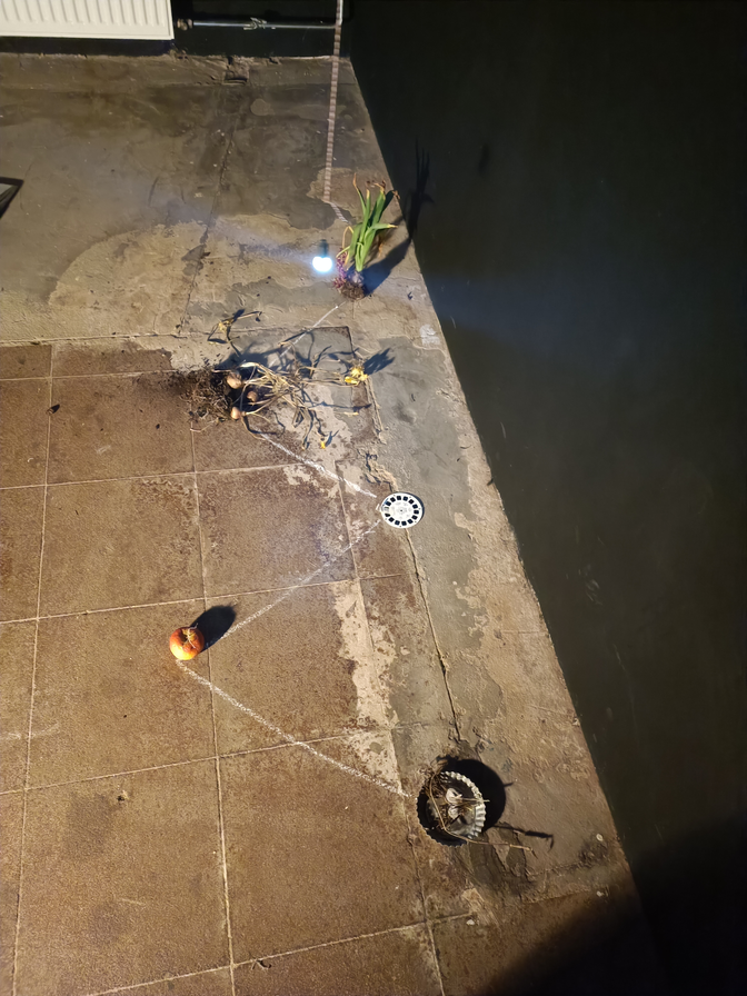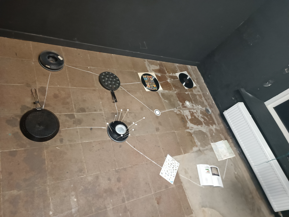 Created a web of objects that float in water. Thinking about the way in which mycellium communicates within itself in a forest, and what it's conversation could look like as a movement. Looking at how they are related, I like to observe how one object instigates movement and the others eventually follow, and the shapes drawn by the wool in between. Also this type of movement is created by the water slowing it down.