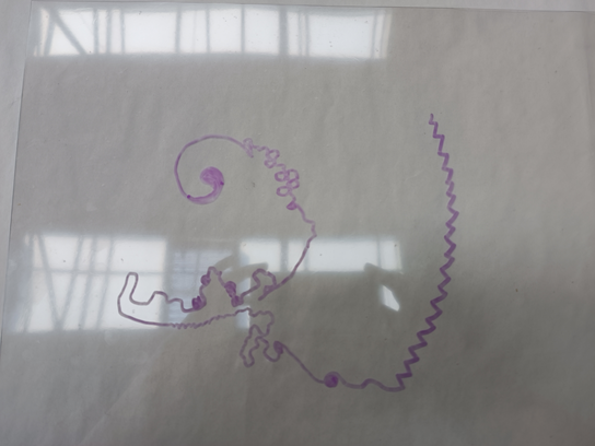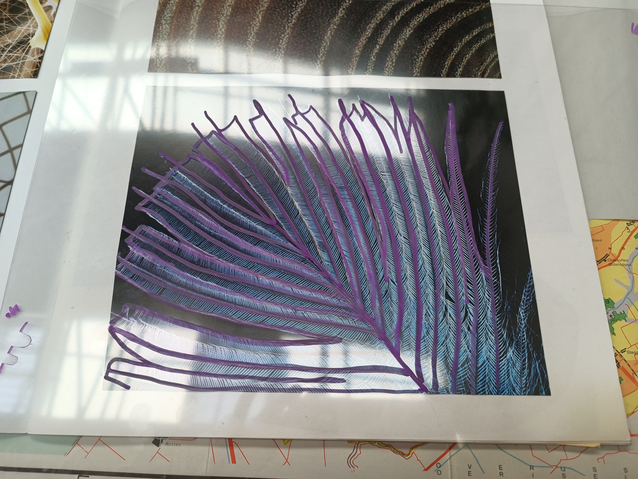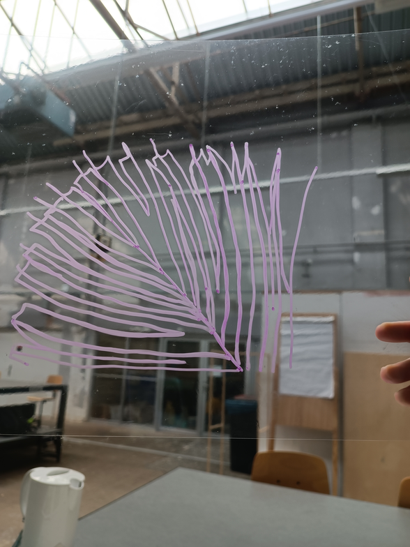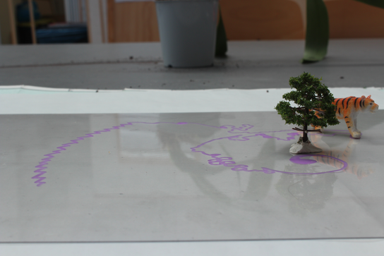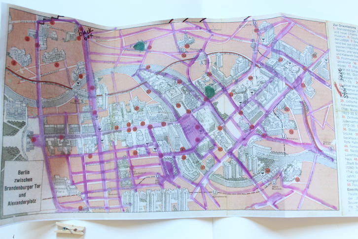 I made an experiment in the studio where I superimposed an old map of Berlin into the room. People followed the purple lines, I tried to make some colour coded correlation points where an existing coffee shop (where Verena had actually been a barrista) was located in the room and corresponded to the map.
