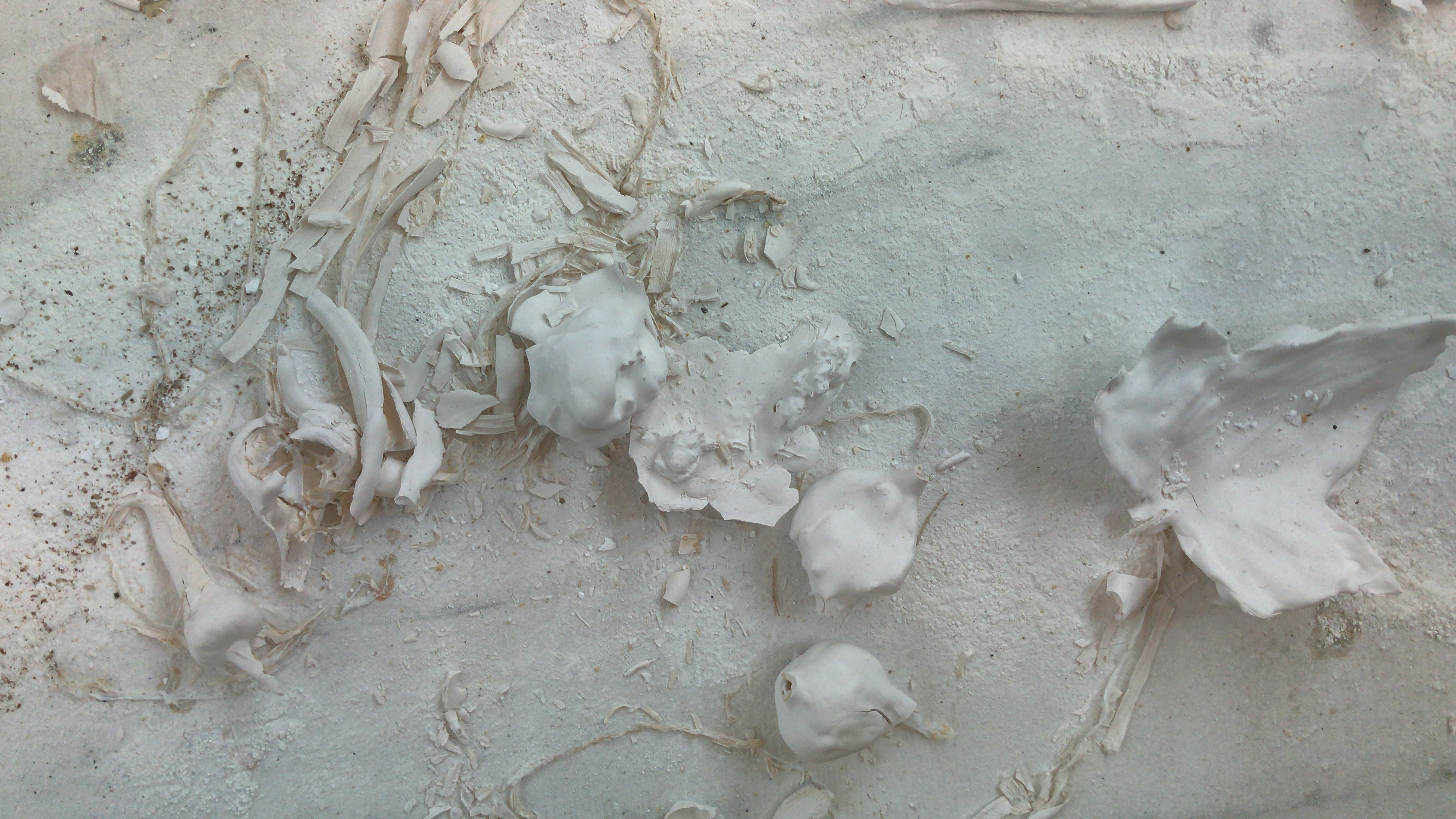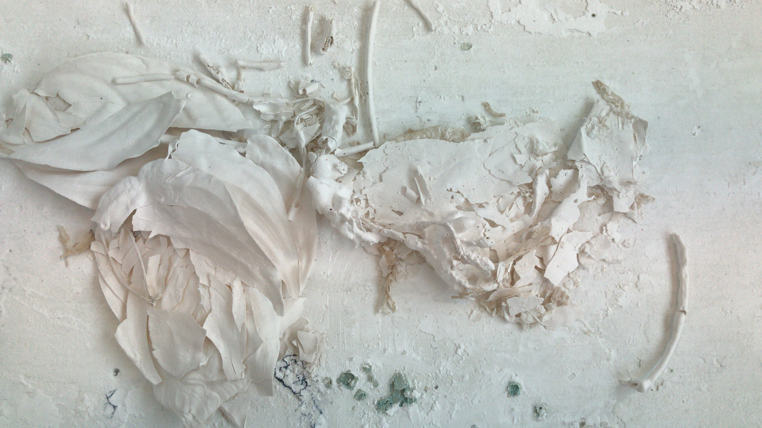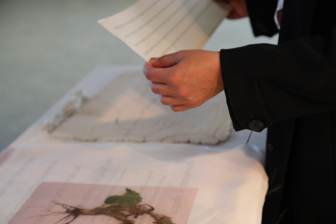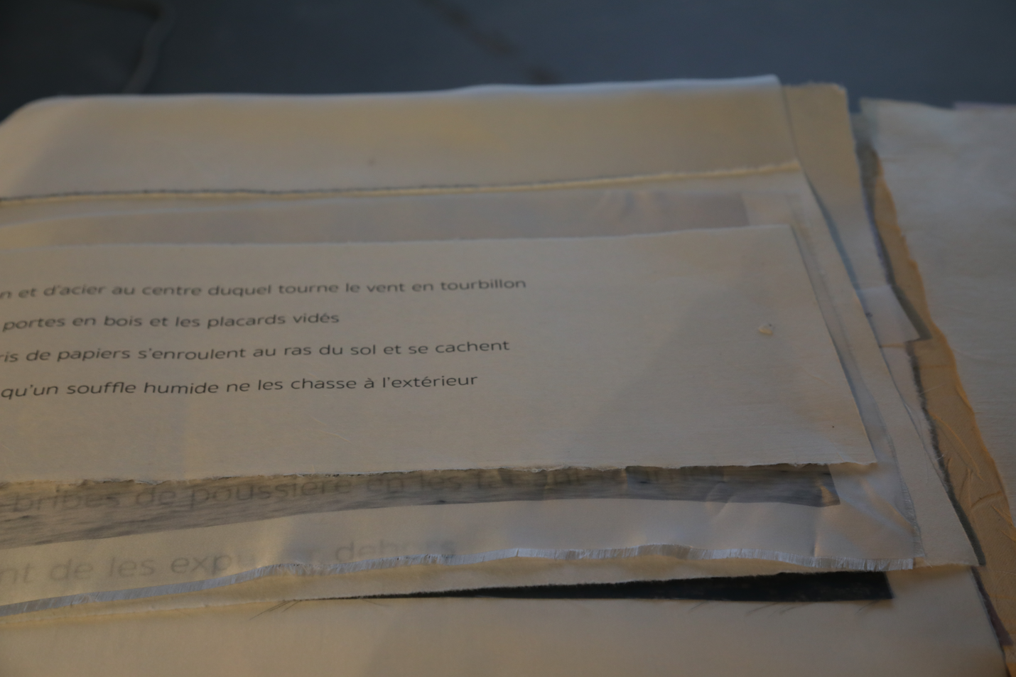 Partie fossile et partie momie, ces feuilles portent en elles toute la perte de la matière. Le produit fini n’est que résiduel, trace, fantôme. Un livre en fragments, sans reliure, dont le visiteur glisse les images et les pages en bribes. Comme un grand tiroir d’archive de mots et de paysages. Un récit en fragments.