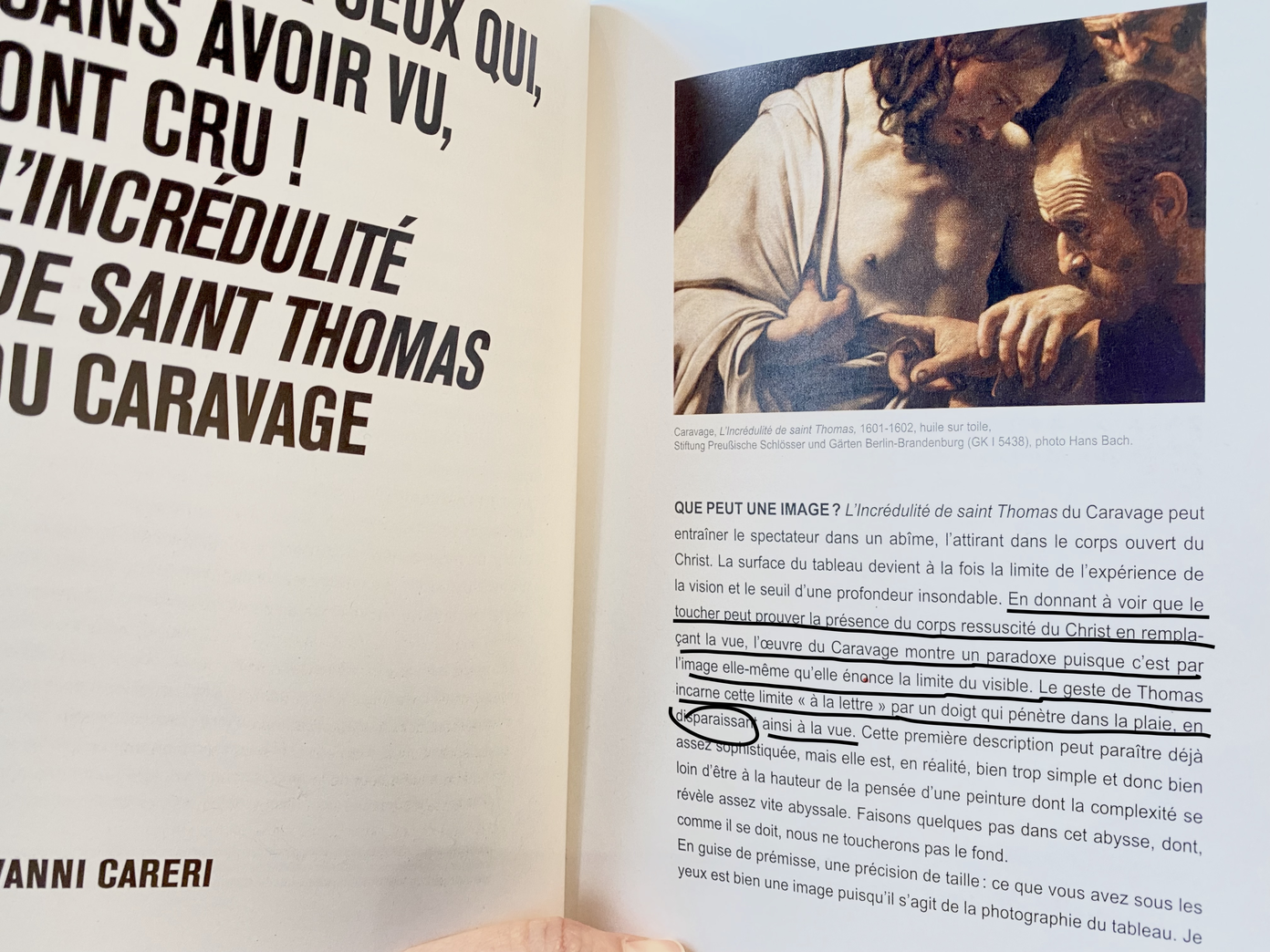A la question « Que peut une image ? », Giovanni Careri répond en donnant l’exemple de L’incrédulité de Saint Thomas de Caravage. Pour lui, « en donnant à voir que le toucher peut prouver la présence du corps ressuscité du Christ en remplaçant la vue, l’œuvre du Caravage montre un paradoxe, puisque c’est par l’image elle-même qu’elle énonce la limite du visible, le geste de Thomas, incarnant cette limite à la lettre, par un doigt qui pénètre dans la plaie en disparaissant à la vue » .