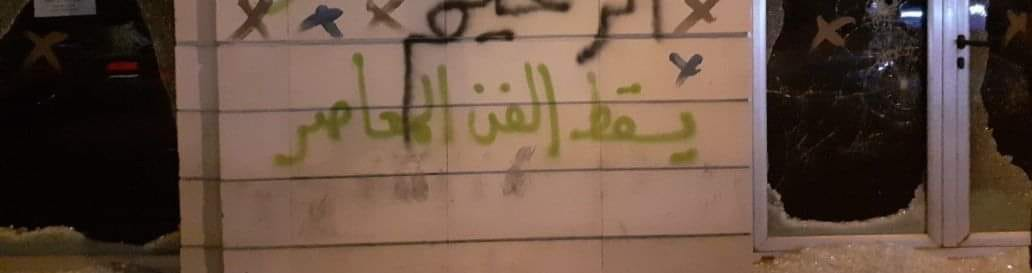 Le lendemain du 17 Octobre, un tag apparait sur le mur d’un immeuble du centre-ville pris par la foule, en Arabe : yasqot al fann almu’asser, qui se traduit simplement par « A bas l’art contemporain ». Il remet en question le monde de l’art, l’accuse d’élitisme néolibéral, de futilité, d’impertinence.
