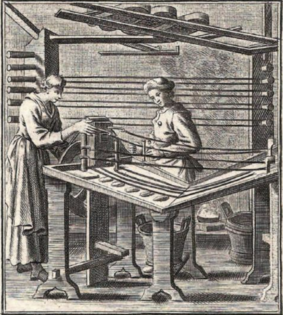 After this process, the ribbons are placed onto a twisting bench, preferably a dark surface (so the many ribbons are clearly visible). This is step seven. Here the string maker must decide the thickness of the strings because this influences how many ribbons are used. A bundle of strings gets tied to one end of a machine called the spindle (See figure 2 below [5]).