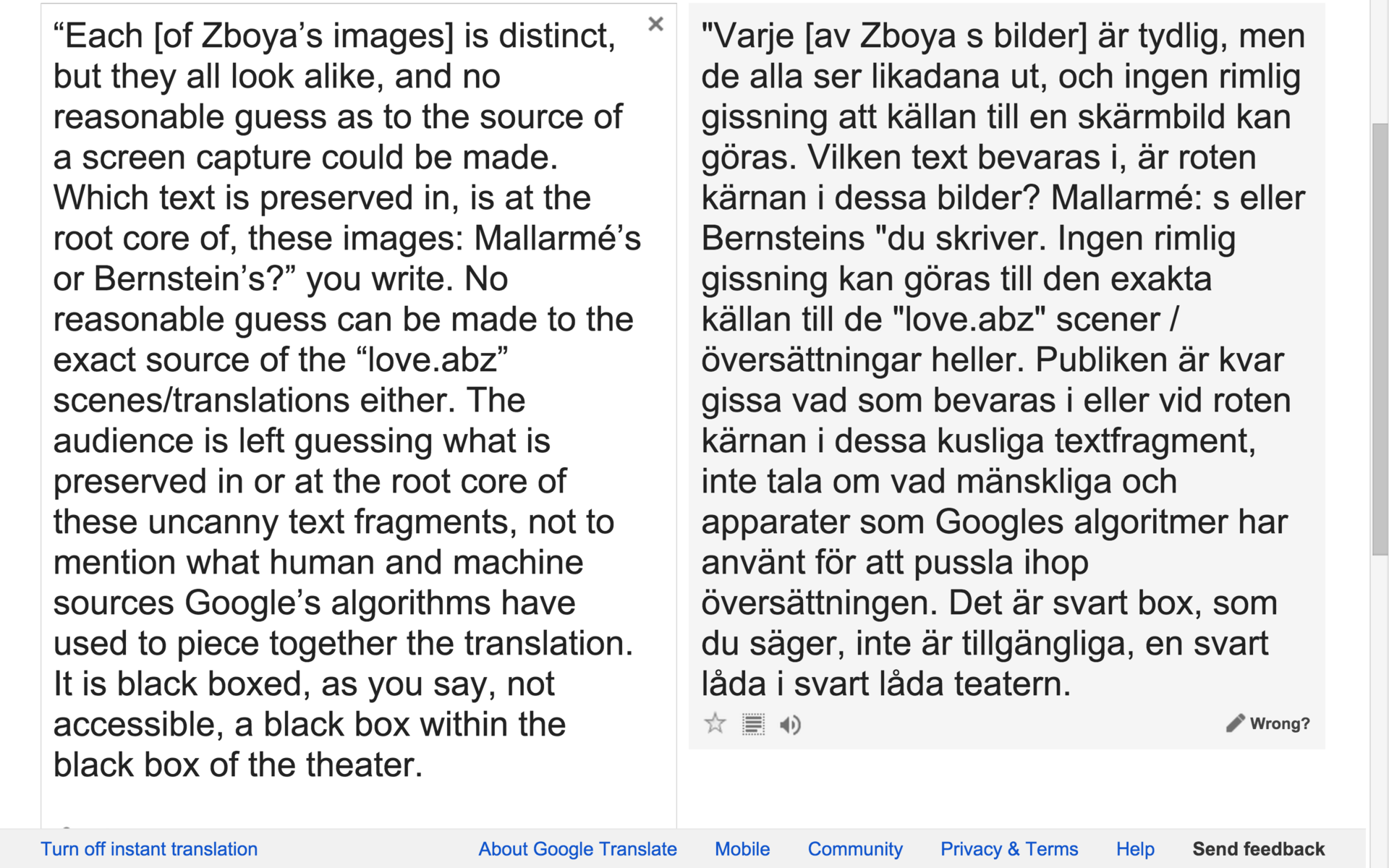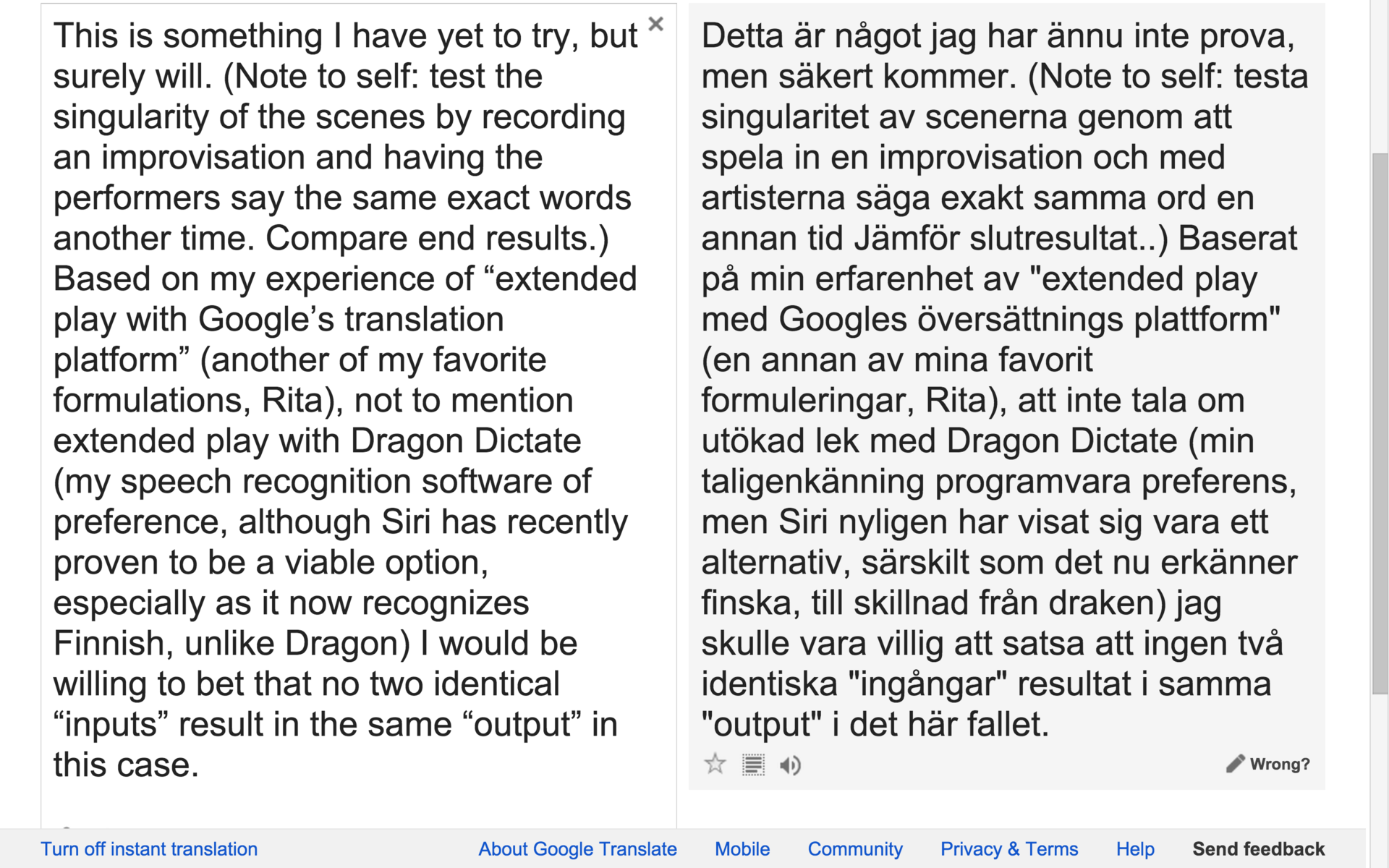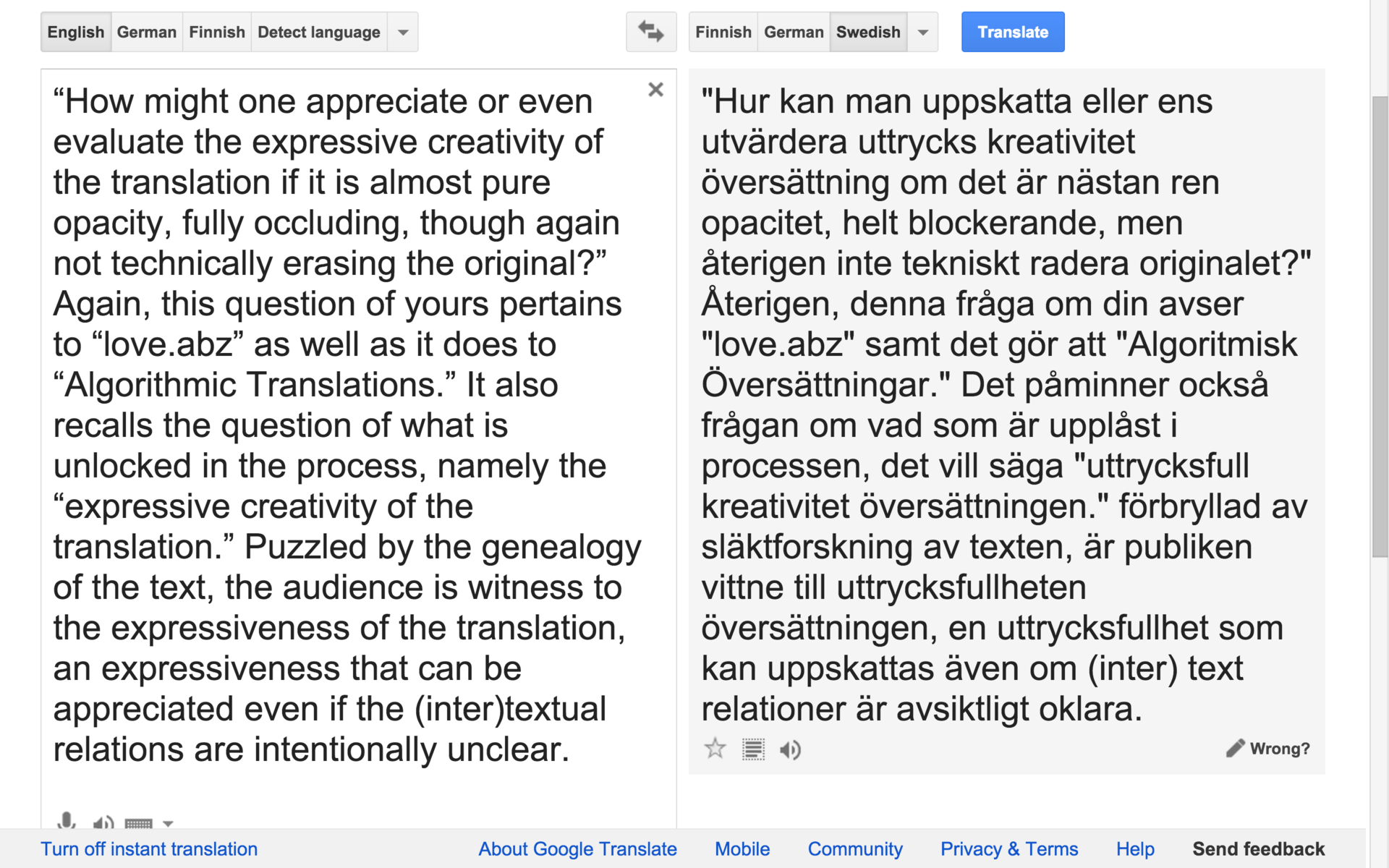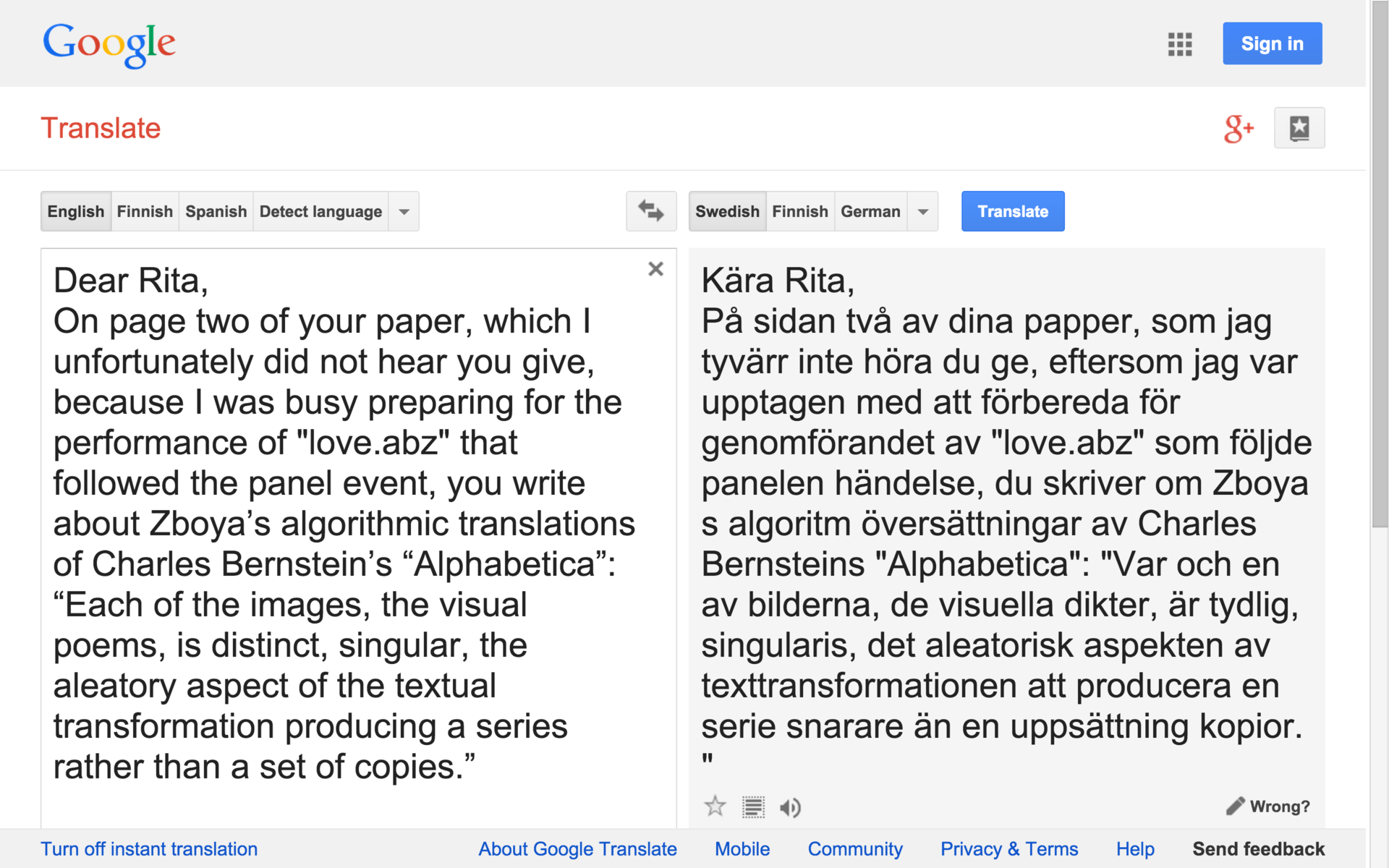 "Dear Rita," a series of eight letters to Rita Raley (Professor of English, University of California, Santa Barbara), is a research response to Raley’s presentation “Algorithmic Translations,” which she gave at the "Performance, Technology, Translation" event in New York in April 2015. Organized by The Barnard Center for Translation Studies and the Department of Theatre, the event explored “the theoretical and practical intersections between contemporary technologies of translation and performance.” In addition to presentations by Raley and W. B. Worthen, the symposium included a performance of love.abz, an independent art work and the artistic part of my doctoral degree at University of the Arts Helsinki, Theater Academy. In "Dear Rita," I use screen captures of the Google Translate website to address through translation the many links and questions that arise from Raley’s insightful presentation. I comment on Raley’s discussion of Eric Zboya’s and Baden Pailthorpe’s work, both visual artists and researchers, and relate them to my own ongoing artistic research project into what I call “live writing.” My inquiry deals with a form of improvisatory, collaborative dramatic writing that employs algorithmic mediation and translation. In asking what the task of the machine translator in performance is or could be, I remark on some of the themes Raley discusses, including those relating to authorship, the nature of algorithmic translation, and the gesture of insistent re-translation of already machine translated text.