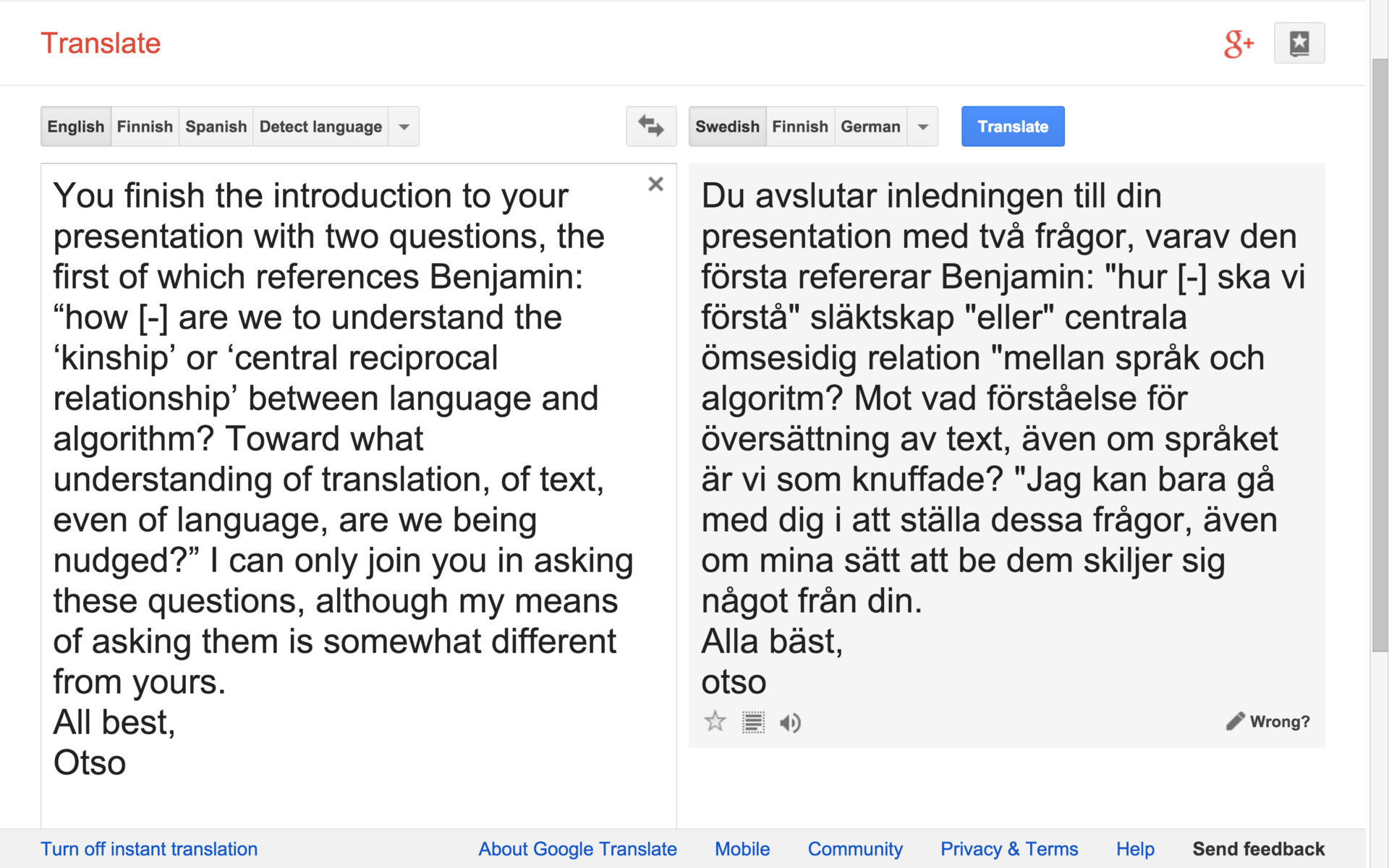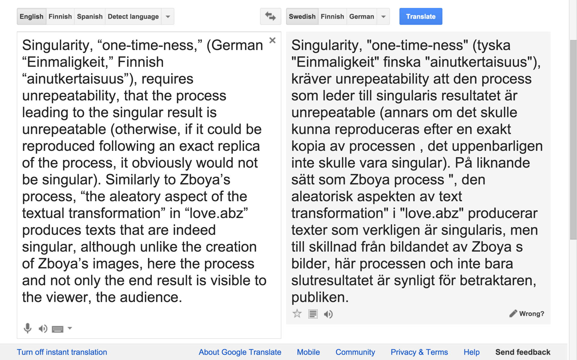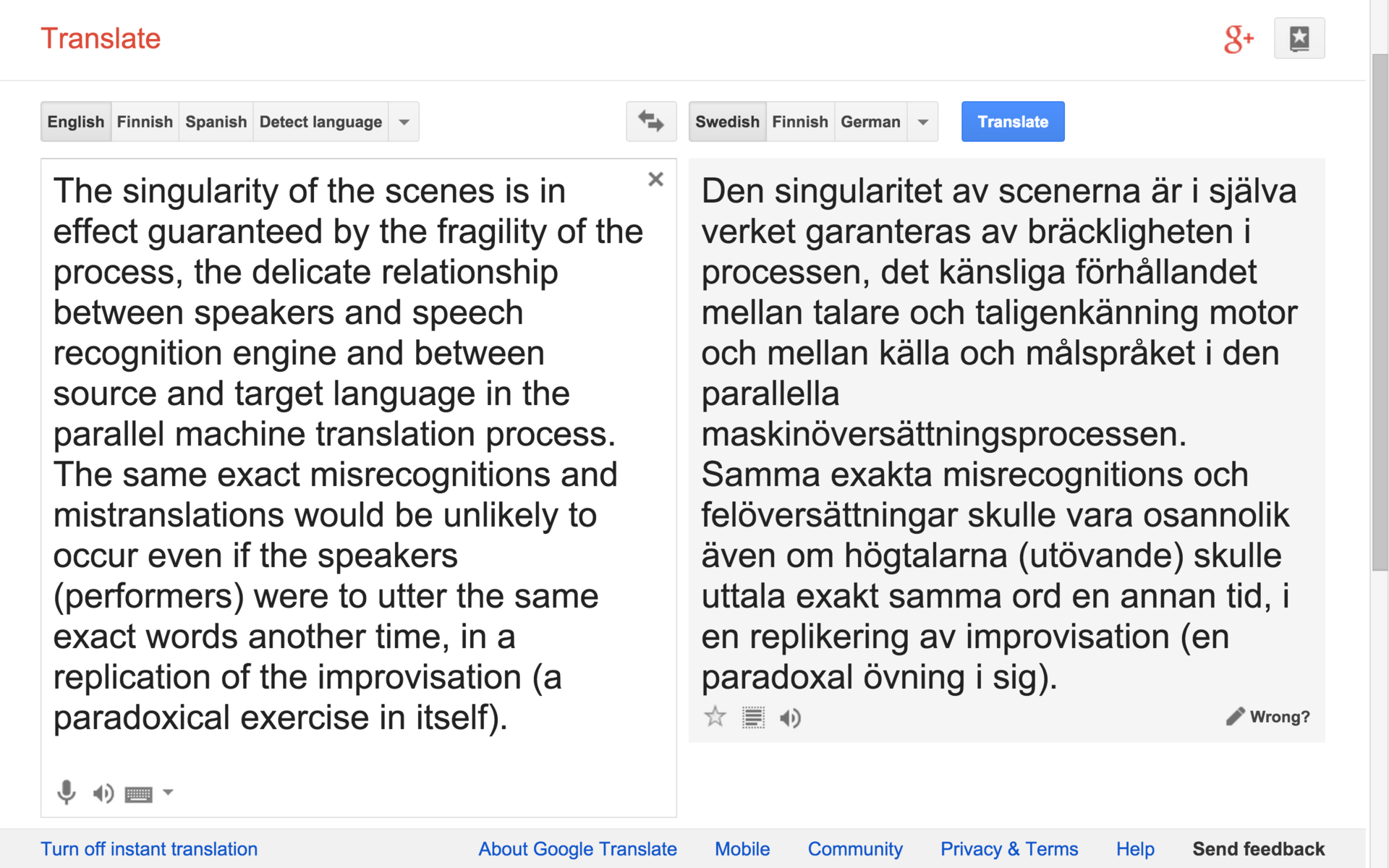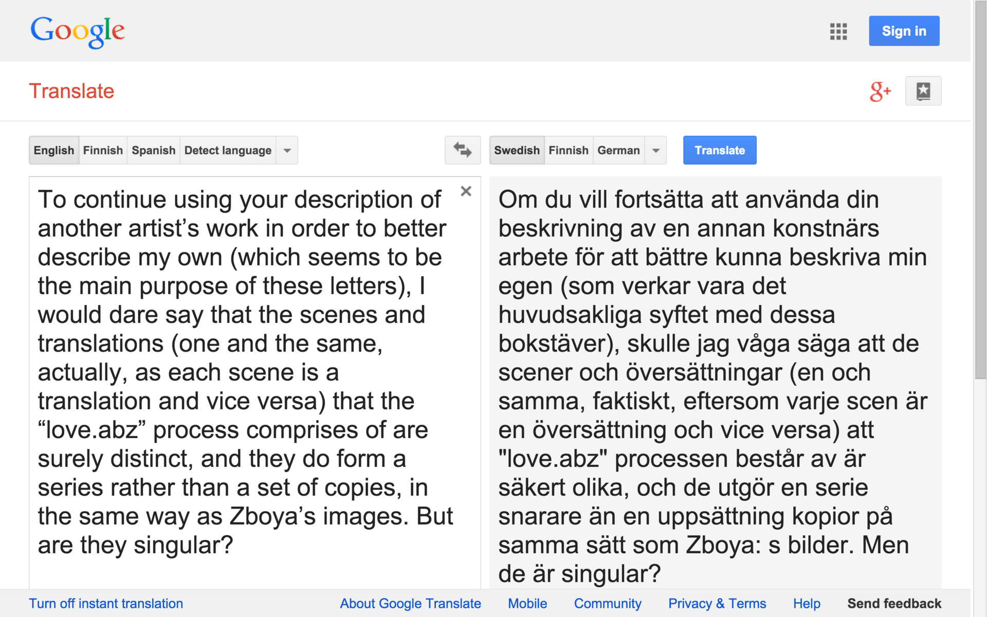 "Dear Rita," a series of eight letters to Rita Raley (Professor of English, University of California, Santa Barbara), is a research response to Raley’s presentation “Algorithmic Translations,” which she gave at the "Performance, Technology, Translation" event in New York in April 2015. Organized by The Barnard Center for Translation Studies and the Department of Theatre, the event explored “the theoretical and practical intersections between contemporary technologies of translation and performance.” In addition to presentations by Raley and W. B. Worthen, the symposium included a performance of love.abz, an independent art work and the artistic part of my doctoral degree at University of the Arts Helsinki, Theater Academy. In "Dear Rita," I use screen captures of the Google Translate website to address through translation the many links and questions that arise from Raley’s insightful presentation. I comment on Raley’s discussion of Eric Zboya’s and Baden Pailthorpe’s work, both visual artists and researchers, and relate them to my own ongoing artistic research project into what I call “live writing.” My inquiry deals with a form of improvisatory, collaborative dramatic writing that employs algorithmic mediation and translation. In asking what the task of the machine translator in performance is or could be, I remark on some of the themes Raley discusses, including those relating to authorship, the nature of algorithmic translation, and the gesture of insistent re-translation of already machine translated text.