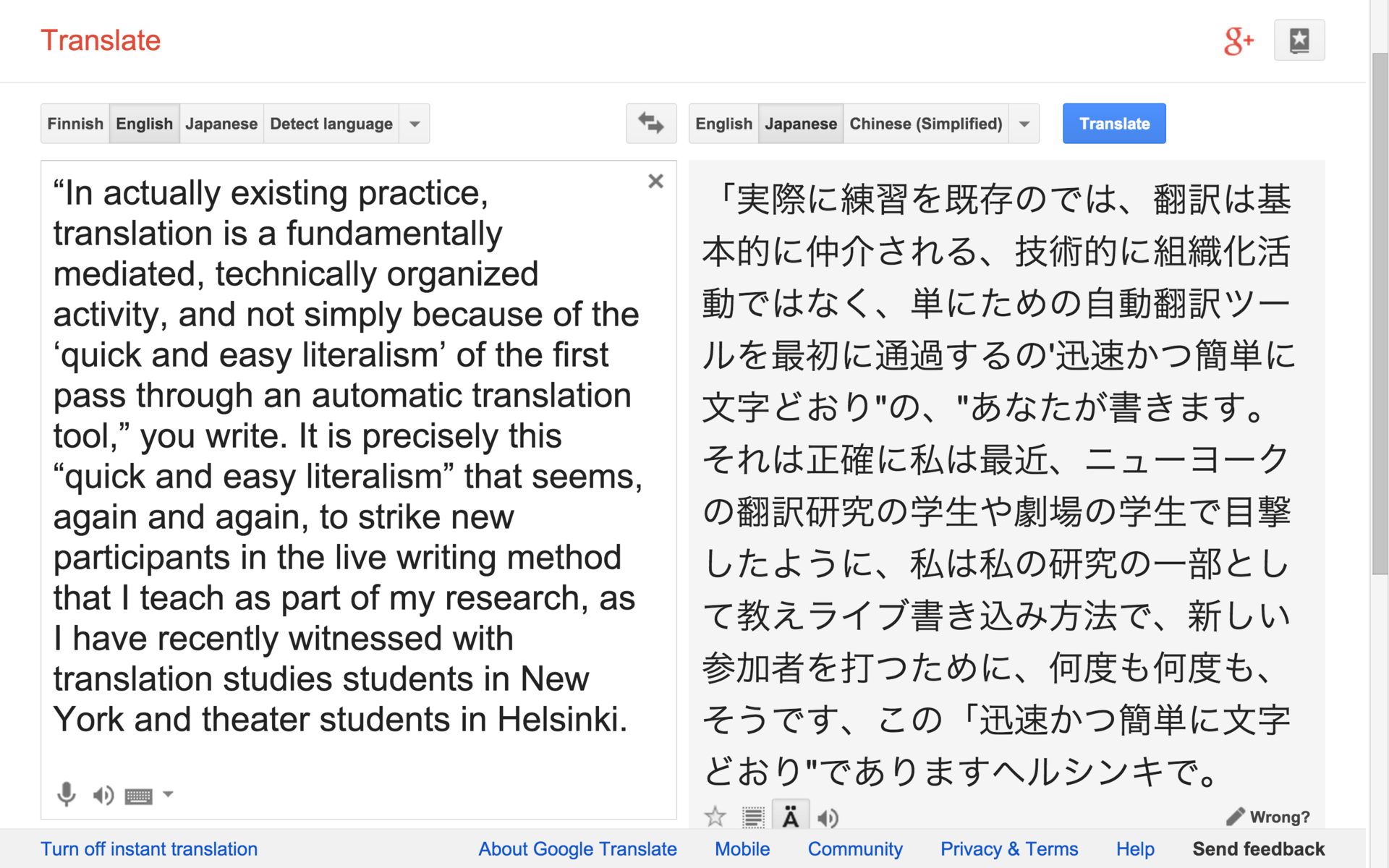 "Dear Rita," a series of eight letters to Rita Raley (Professor of English, University of California, Santa Barbara), is a research response to Raley’s presentation “Algorithmic Translations,” which she gave at the "Performance, Technology, Translation" event in New York in April 2015. Organized by The Barnard Center for Translation Studies and the Department of Theatre, the event explored “the theoretical and practical intersections between contemporary technologies of translation and performance.” In addition to presentations by Raley and W. B. Worthen, the symposium included a performance of love.abz, an independent art work and the artistic part of my doctoral degree at University of the Arts Helsinki, Theater Academy. In "Dear Rita," I use screen captures of the Google Translate website to address through translation the many links and questions that arise from Raley’s insightful presentation. I comment on Raley’s discussion of Eric Zboya’s and Baden Pailthorpe’s work, both visual artists and researchers, and relate them to my own ongoing artistic research project into what I call “live writing.” My inquiry deals with a form of improvisatory, collaborative dramatic writing that employs algorithmic mediation and translation. In asking what the task of the machine translator in performance is or could be, I remark on some of the themes Raley discusses, including those relating to authorship, the nature of algorithmic translation, and the gesture of insistent re-translation of already machine translated text.
