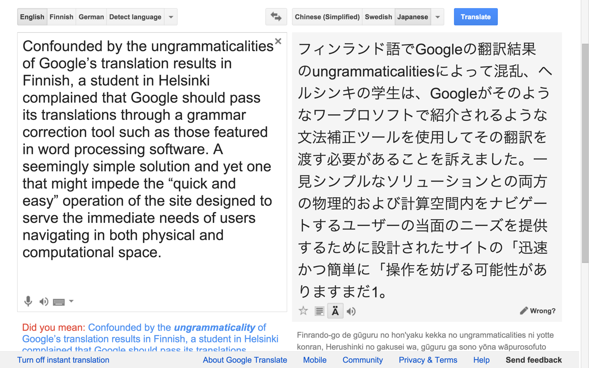 "Dear Rita," a series of eight letters to Rita Raley (Professor of English, University of California, Santa Barbara), is a research response to Raley’s presentation “Algorithmic Translations,” which she gave at the "Performance, Technology, Translation" event in New York in April 2015. Organized by The Barnard Center for Translation Studies and the Department of Theatre, the event explored “the theoretical and practical intersections between contemporary technologies of translation and performance.” In addition to presentations by Raley and W. B. Worthen, the symposium included a performance of love.abz, an independent art work and the artistic part of my doctoral degree at University of the Arts Helsinki, Theater Academy. In "Dear Rita," I use screen captures of the Google Translate website to address through translation the many links and questions that arise from Raley’s insightful presentation. I comment on Raley’s discussion of Eric Zboya’s and Baden Pailthorpe’s work, both visual artists and researchers, and relate them to my own ongoing artistic research project into what I call “live writing.” My inquiry deals with a form of improvisatory, collaborative dramatic writing that employs algorithmic mediation and translation. In asking what the task of the machine translator in performance is or could be, I remark on some of the themes Raley discusses, including those relating to authorship, the nature of algorithmic translation, and the gesture of insistent re-translation of already machine translated text.