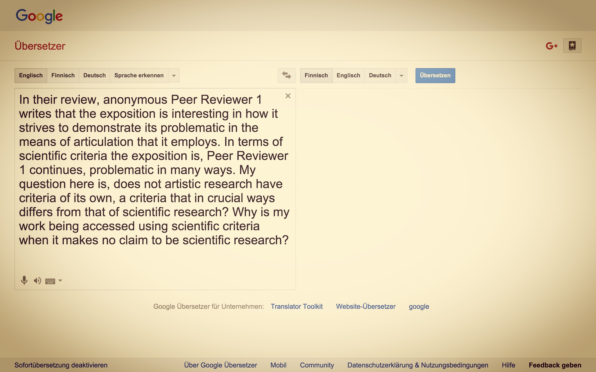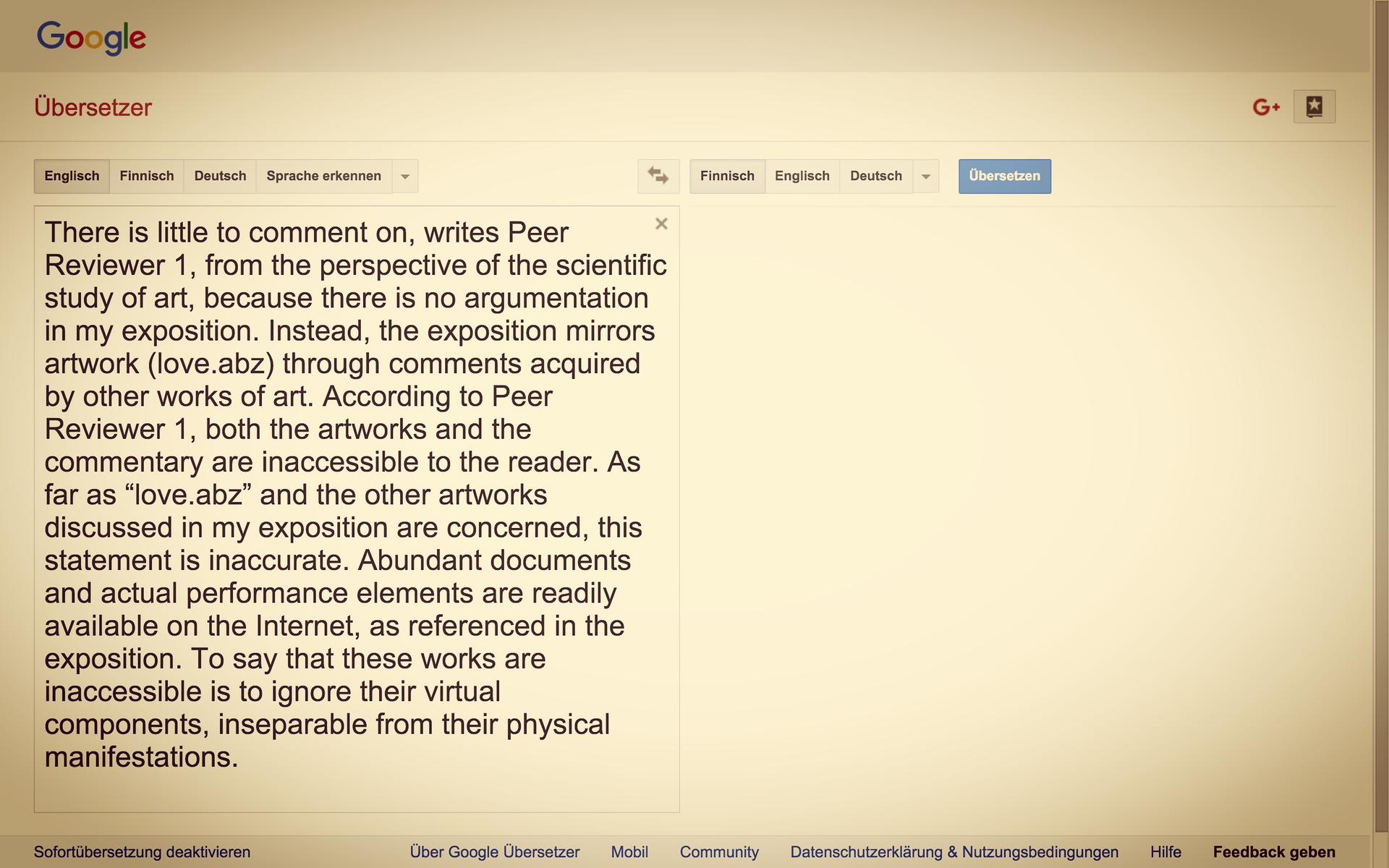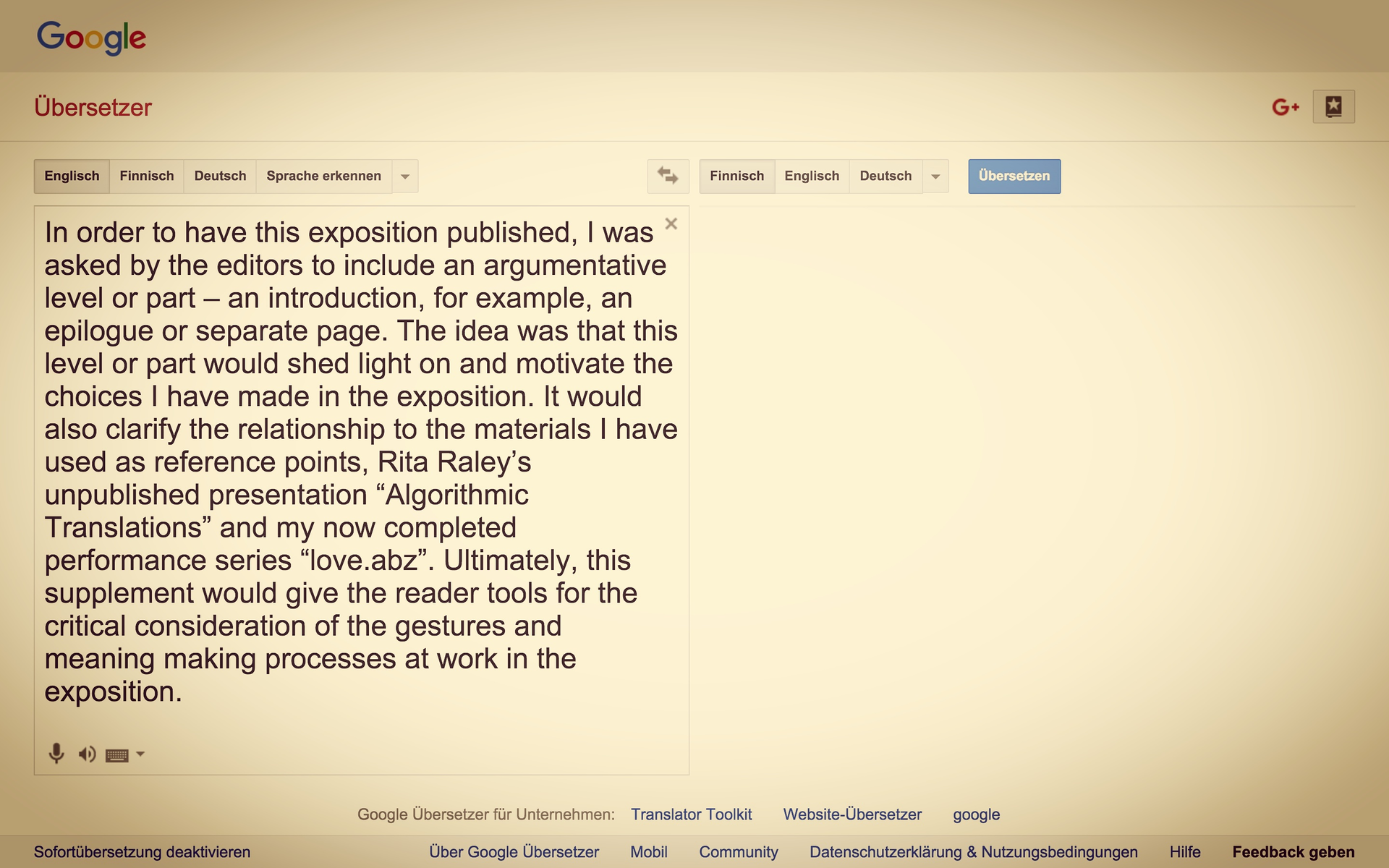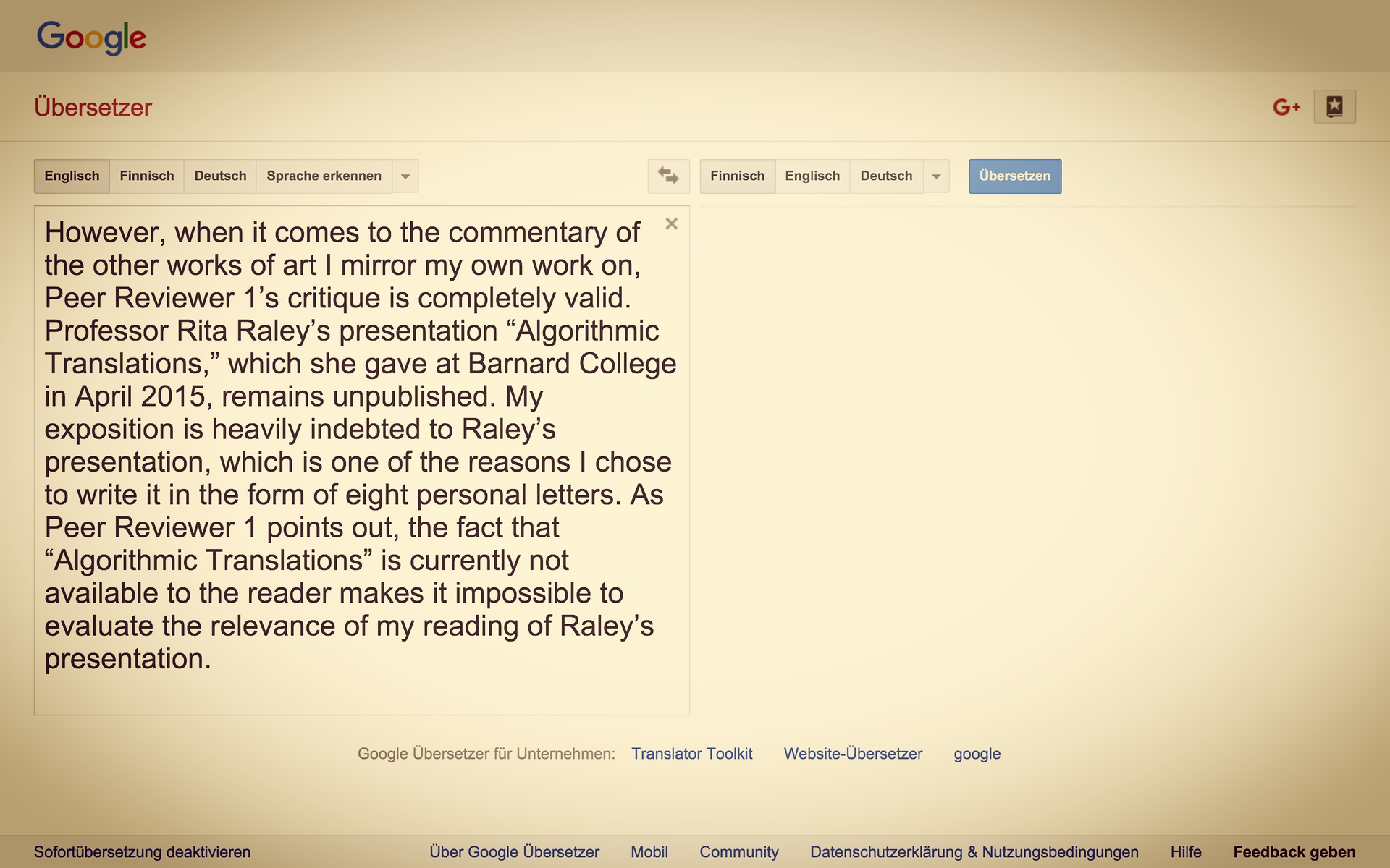 "Dear Rita," a series of eight letters to Rita Raley (Professor of English, University of California, Santa Barbara), is a research response to Raley’s presentation “Algorithmic Translations,” which she gave at the "Performance, Technology, Translation" event in New York in April 2015. Organized by The Barnard Center for Translation Studies and the Department of Theatre, the event explored “the theoretical and practical intersections between contemporary technologies of translation and performance.” In addition to presentations by Raley and W. B. Worthen, the symposium included a performance of love.abz, an independent art work and the artistic part of my doctoral degree at University of the Arts Helsinki, Theater Academy. In "Dear Rita," I use screen captures of the Google Translate website to address through translation the many links and questions that arise from Raley’s insightful presentation. I comment on Raley’s discussion of Eric Zboya’s and Baden Pailthorpe’s work, both visual artists and researchers, and relate them to my own ongoing artistic research project into what I call “live writing.” My inquiry deals with a form of improvisatory, collaborative dramatic writing that employs algorithmic mediation and translation. In asking what the task of the machine translator in performance is or could be, I remark on some of the themes Raley discusses, including those relating to authorship, the nature of algorithmic translation, and the gesture of insistent re-translation of already machine translated text.