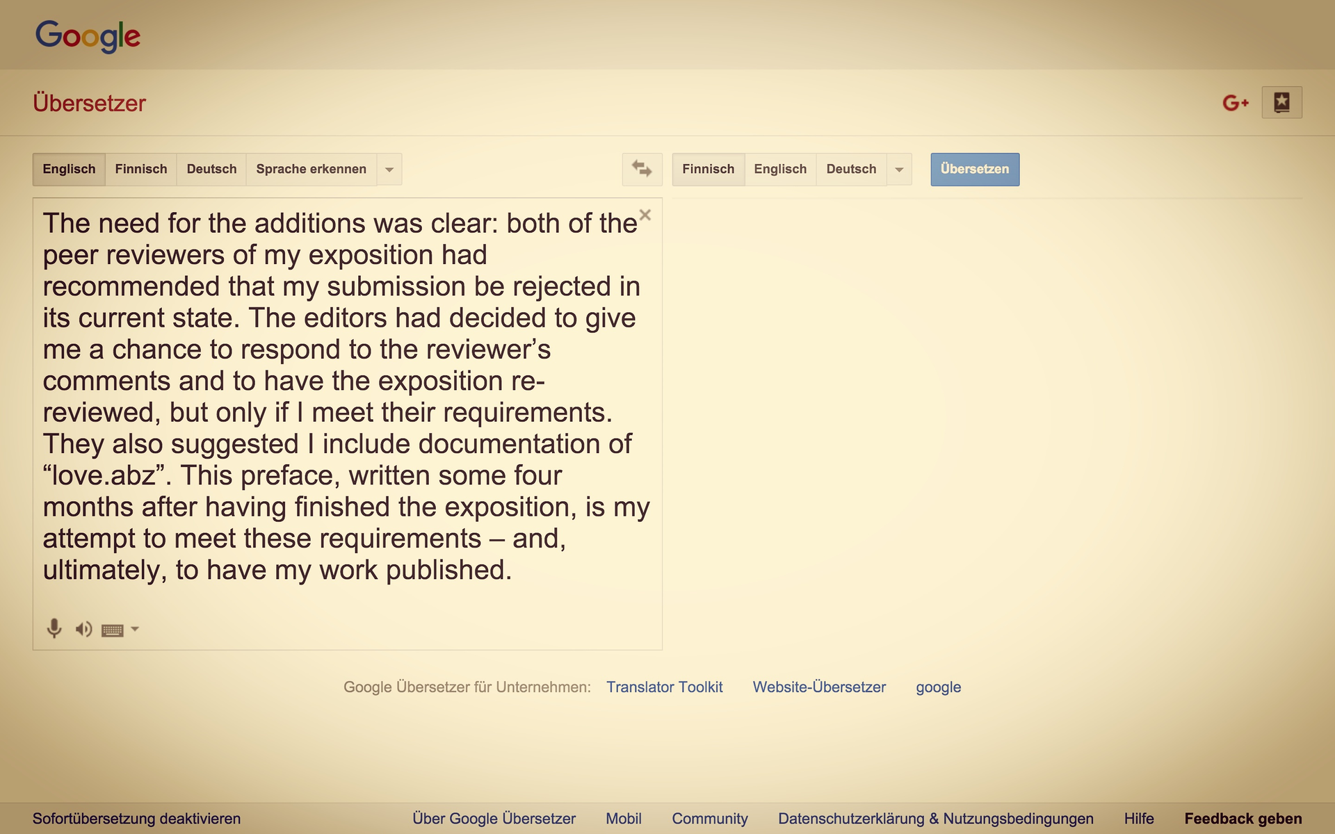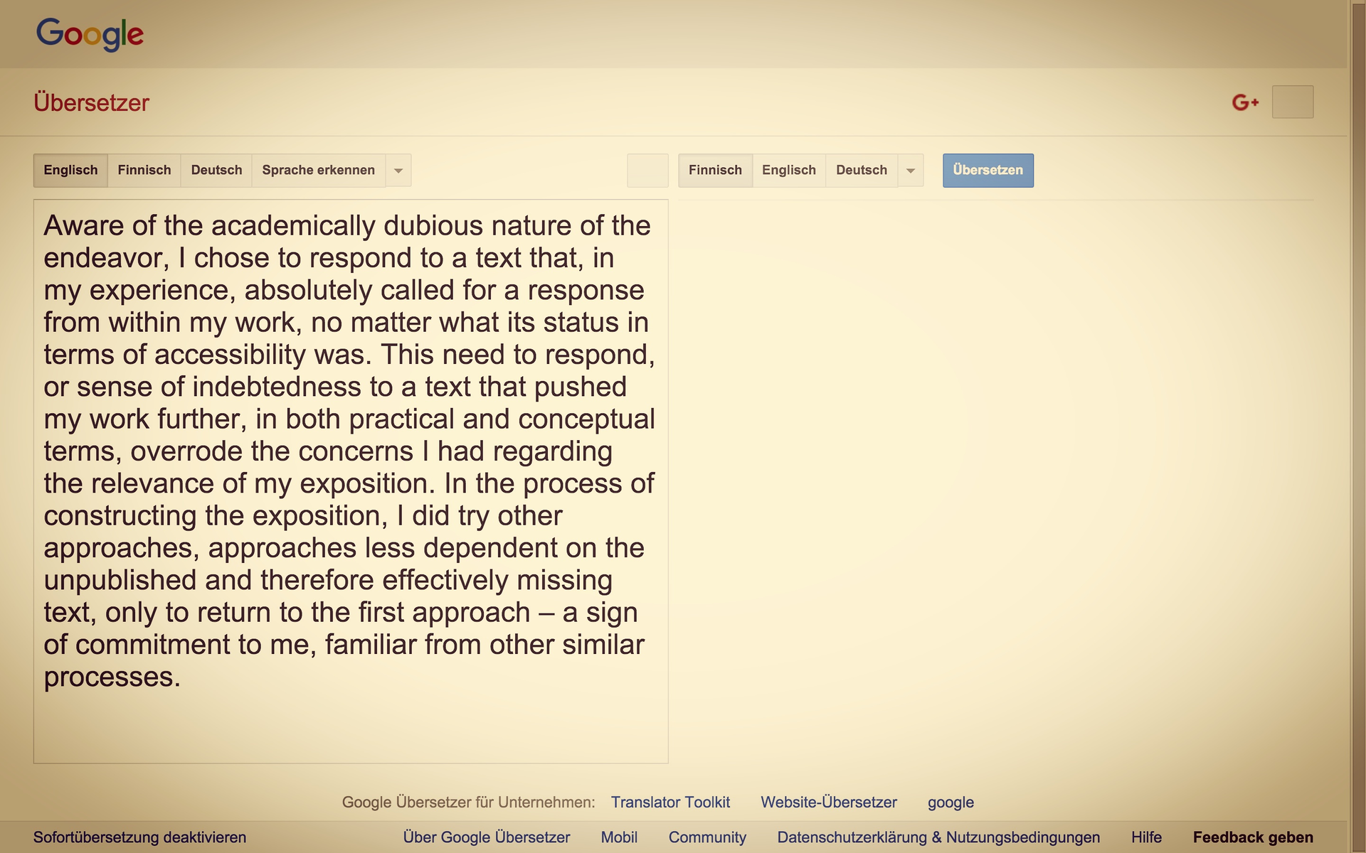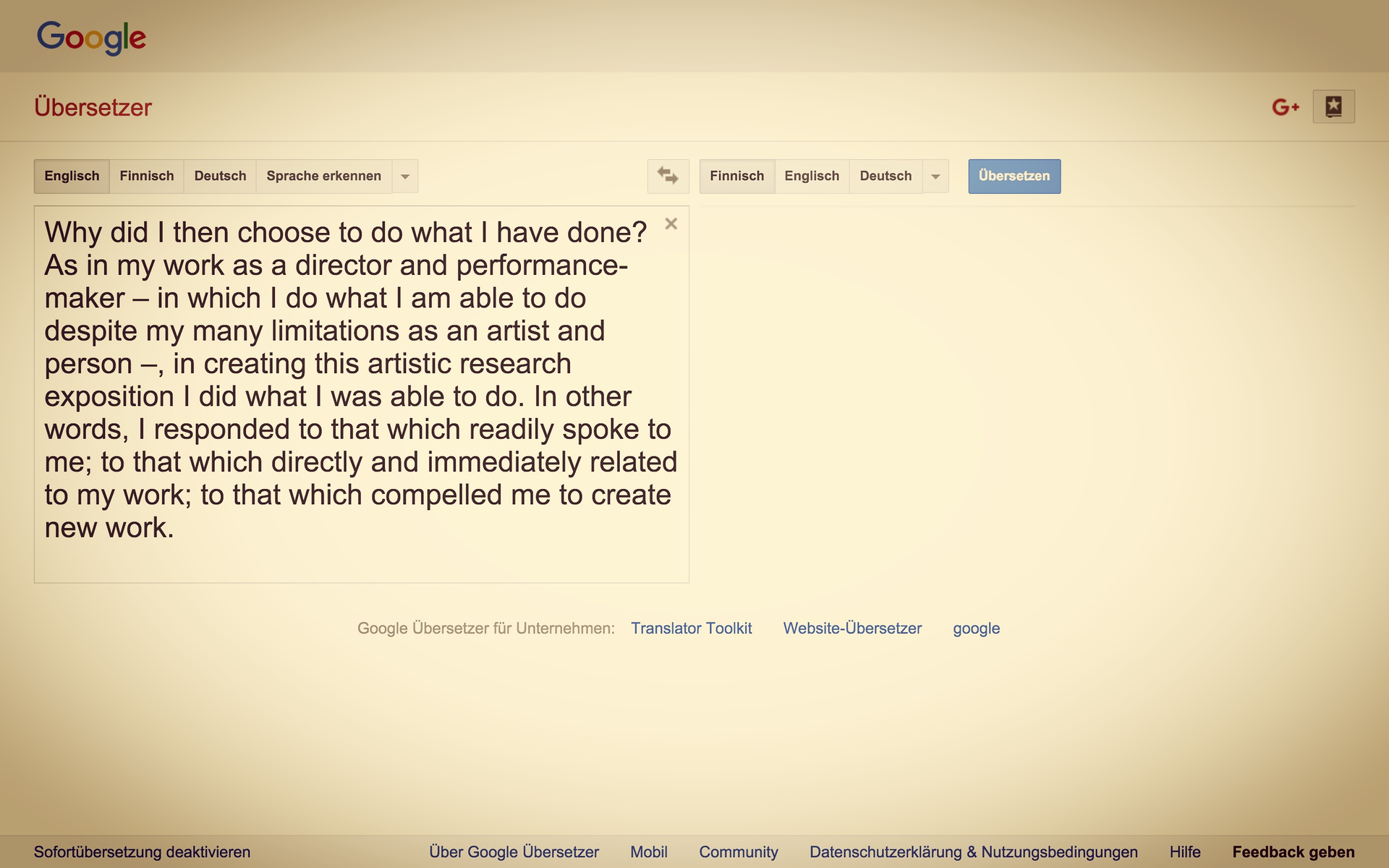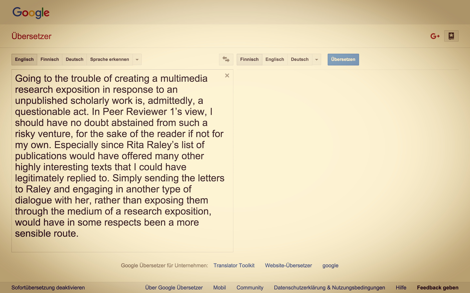 "Dear Rita," a series of eight letters to Rita Raley (Professor of English, University of California, Santa Barbara), is a research response to Raley’s presentation “Algorithmic Translations,” which she gave at the "Performance, Technology, Translation" event in New York in April 2015. Organized by The Barnard Center for Translation Studies and the Department of Theatre, the event explored “the theoretical and practical intersections between contemporary technologies of translation and performance.” In addition to presentations by Raley and W. B. Worthen, the symposium included a performance of love.abz, an independent art work and the artistic part of my doctoral degree at University of the Arts Helsinki, Theater Academy. In "Dear Rita," I use screen captures of the Google Translate website to address through translation the many links and questions that arise from Raley’s insightful presentation. I comment on Raley’s discussion of Eric Zboya’s and Baden Pailthorpe’s work, both visual artists and researchers, and relate them to my own ongoing artistic research project into what I call “live writing.” My inquiry deals with a form of improvisatory, collaborative dramatic writing that employs algorithmic mediation and translation. In asking what the task of the machine translator in performance is or could be, I remark on some of the themes Raley discusses, including those relating to authorship, the nature of algorithmic translation, and the gesture of insistent re-translation of already machine translated text.
