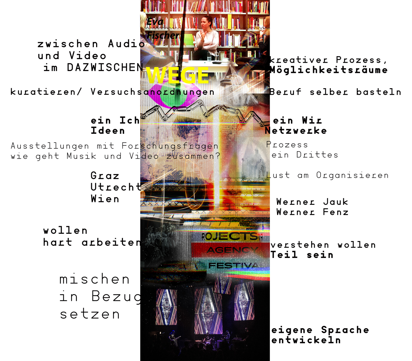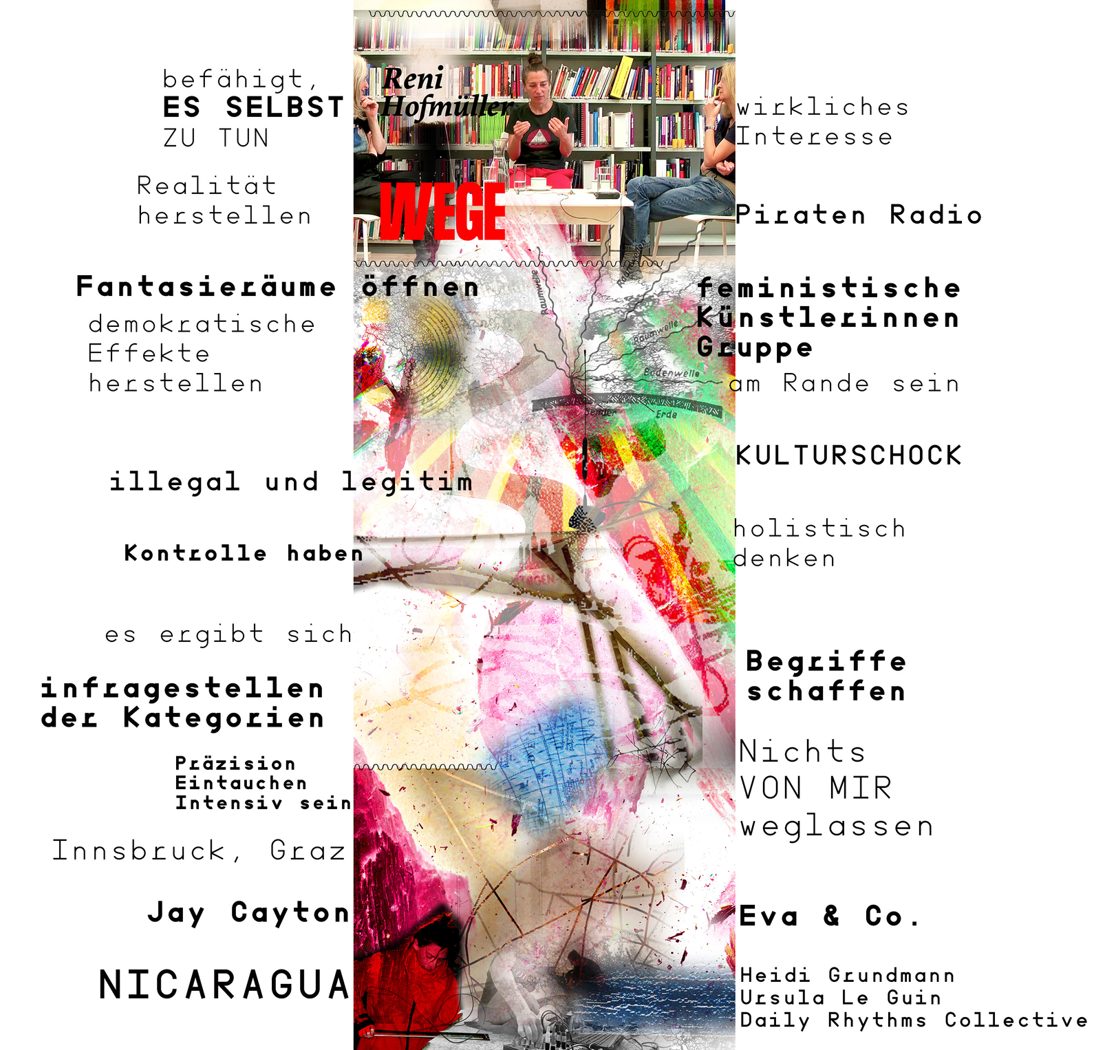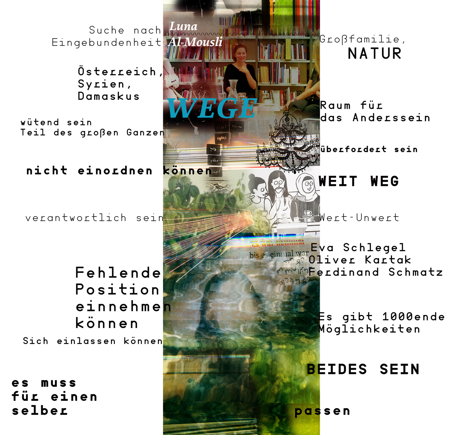 ...sich in Raum und Zeit erzählen Gespräche ueber Haltungen, Vorgehensweisen, Lebenswege, kuenstlerische Konzepte... im Dazwischen. Das Interdisziplinaere hinterfragen, mit Menschen deren Wege und Erfolge in Zwischenraeumen daheim sind.