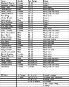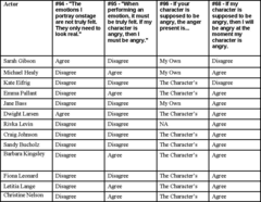 On the chart, there are only 2 respondents who say that the emotions portrayed onstage only need to look real (Dwight Larsen, no longer acting, and Sarah Gibson), but they also say that they are not angry when the character is angry, which puts them in the majority of opinions. Then the two of them split on their opinion about whose anger it is – Gibson says “my own” and Larsen says “the character “. They also split on the question of whether they are angry when the character is. When looking at the rest of the responses, we see that most on the chart feel that the emotions need to be “real” and that they do not have to be “feeling” the emotion. They also say that any emotions felt are the character’s and that they are angry at the same moment the character is. This sample is fairly representative of the statistical population that was described earlier.