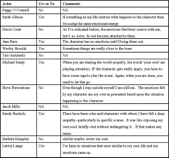 As we examine the comments from the interviews, it becomes quite clear that despite some perceived differences in the questionnaire responses, these are quite small. It seems to come down to whether the respondent believes that the emotions used issue from their own experience, that is, they are “remembered” or are merely versions of those emotions being “tweaked” in various ways to achieve the task of the scene. This is a very subtle distinction. In this first comment, Sarah Gibson, who says emotions only need to look real, demonstrates subtleties of this distinction: