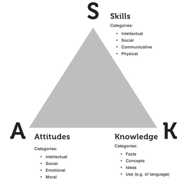 En del av TLR är ASK-figuren (till höger), som Nottingham menar underlättar planering för hur undervisning kan bedrivas (Nottingham 2019, 5). Genom att dra ett streck från K till A eller S ser man vilka attityder eller förmågor som kan användas för att öva kunskaper, detta leder också till att dessa attityder eller förmågor samtidigt också utvecklas.