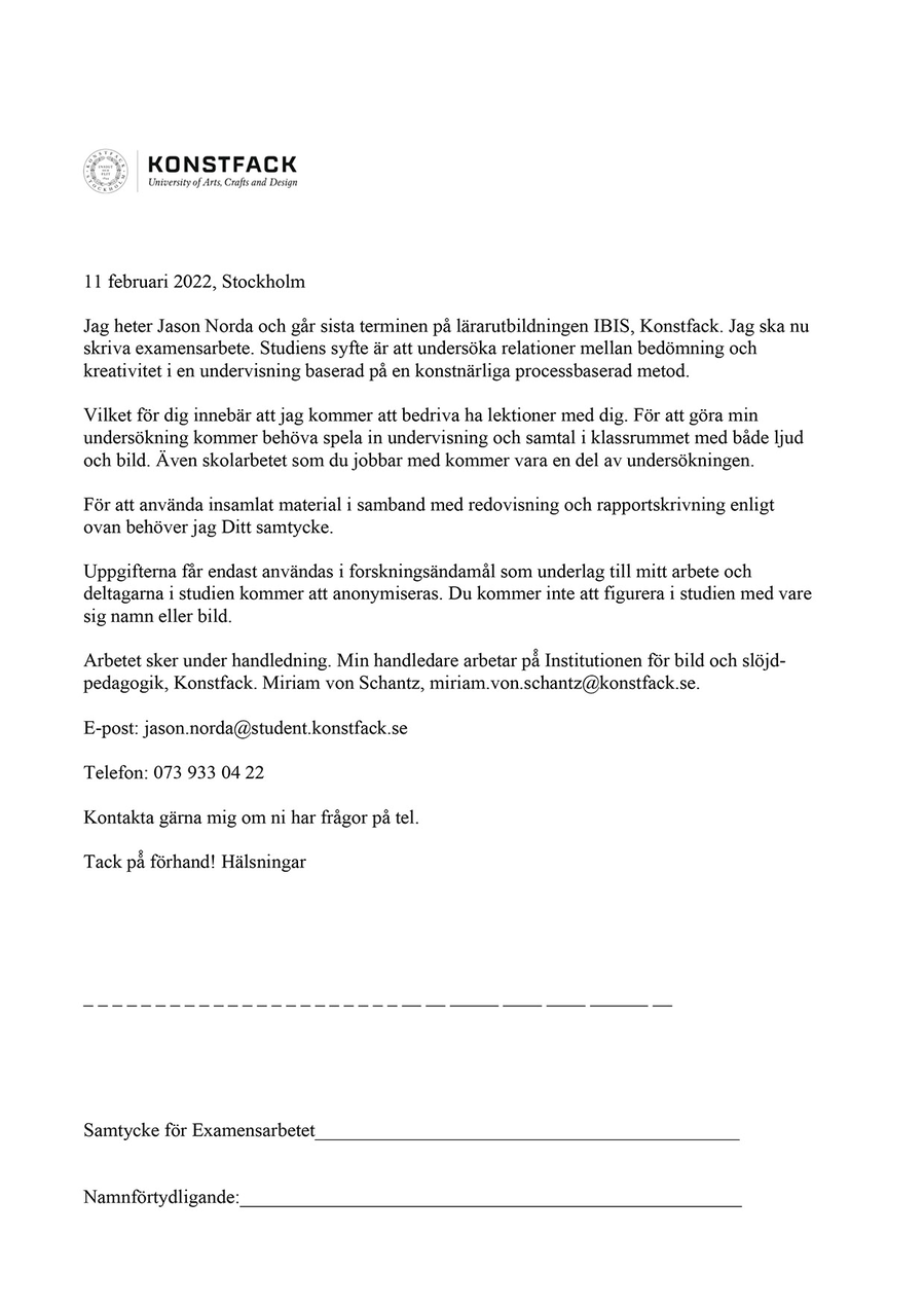 Deltagarna presenterades för undersökningen, dess upplägg och syfte i enlighet med Vetenskapsrådets etiska principer. Deltagarna försäkrades om att deltagande är frivilligt och kan närsomhelst avbrytas. Metoder för insamling av data tydliggjordes med en försäkran om att allting skulle anonymiseras.