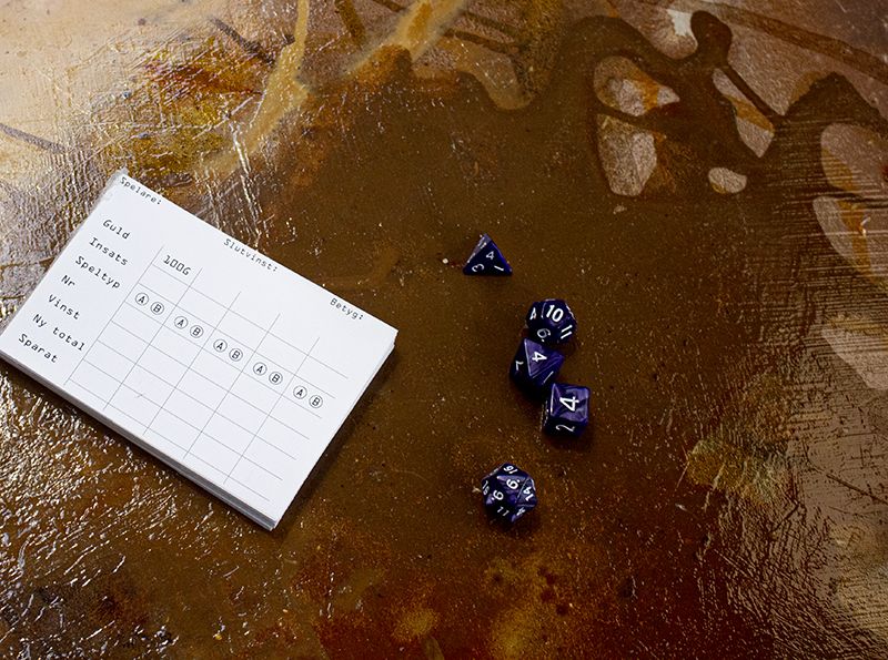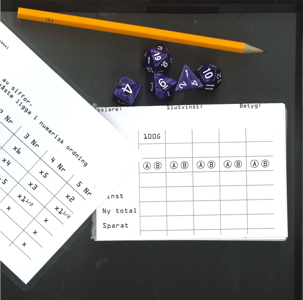 Exempel 2: Vera väljer spelsätt B. Hen har 100g och satsar 50g på nr 6, med en d6. Sedan slår hen 3. Men istället för att i nästa omgång ha 50g att spela med. Har hen fortfarande 100g och har sparat -50 (vinsten – insatsen).