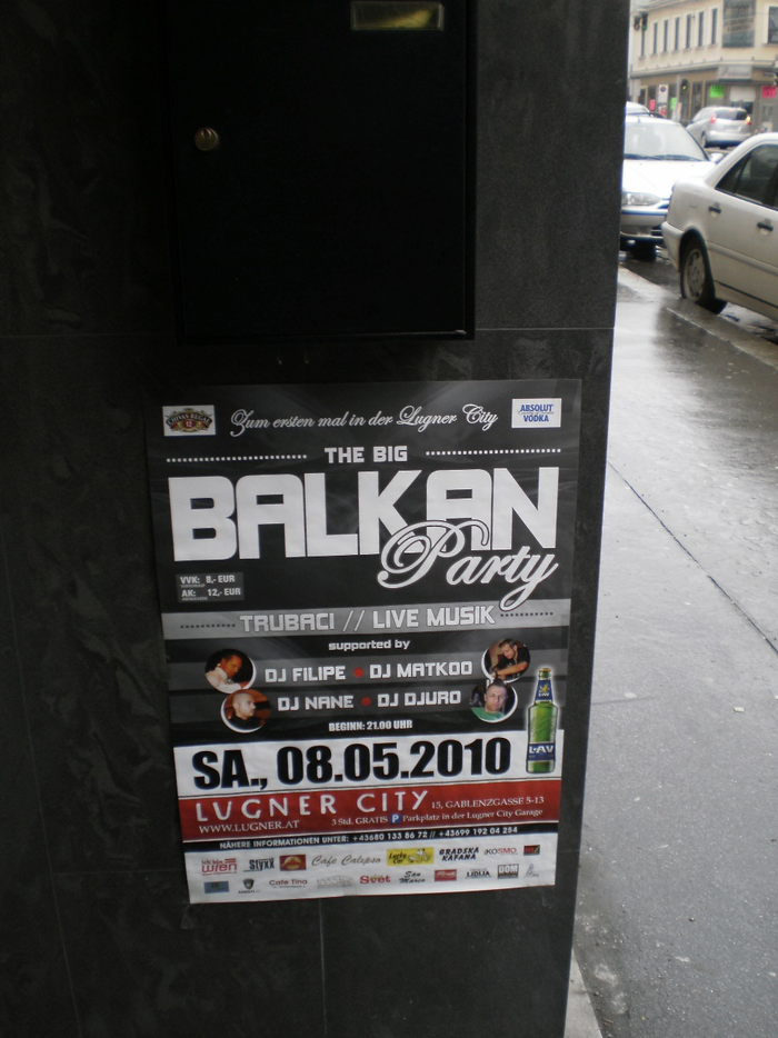 Exploring Vienna as a Balkan soundscape also allows for the blending of different sensory inputs. In Vienna, references to Balkan music are almost always accompanied by images, whether these are the publicly posted flyers, posters, and other visual advertising for upcoming sound events or the music videos shot on city streets. In my past research into the Viennese Balkan soundscape, I therefore broadened the definition of “Balkan” sounds beyond its traditional associations with the squeal of the zurla and booming rhythms of ethnic music: this was also a search for the visual signs of Balkan sounds. By adding this visual component, I could circumvent certain obstacles around sounds that were difficult to connect to the Balkan space, and thus inaccessible to analysis. (This includes, for example, sounds that were lost due to the subaltern position of their emitters.) While I am not an insider of the groups in this study and only have a limited knowledge and understanding of different South Slavic languages, my initial work relied on the ethnographic method of direct observation. These explorations of the physical city used practices based on those of the flâneur (Benjamin 2009) and variations on the Situationist dérive strategy (Debord 1958).