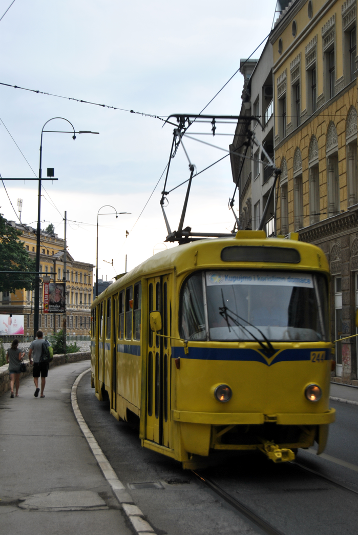 Such a reaction might be understood as similar to residents’ reactions to the trolleybuses and trams that connect the Sarajevo neighborhoods. The sound of a tram rattling on poorly maintained rails while moving is a noteworthy soundmark.[10] Inside, one inhales the smell of the crowd and metal as the metallic parts and joints sway en route. Rides in trams offer multisensory experiences as one takes in and listens to high school students chatting, people travelling to work, and elderly passengers reading newspapers in their seats.