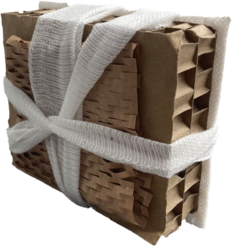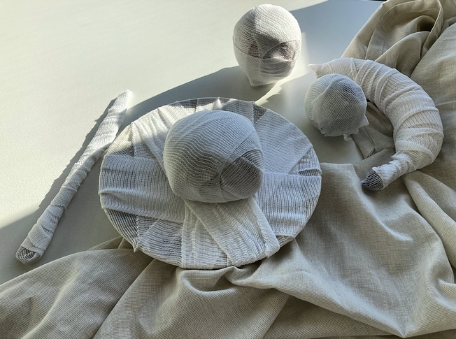 "They began with wrapping objects, small everyday items such as bottles and cans packed in fabric or synthetic materials and twine. The idea behind the wrapping was that the concealment encourages the viewer to look with renewed curiosity to the object beneath and the space in which it exists, whilst also adding new sculptural qualities to ordinary shapes."