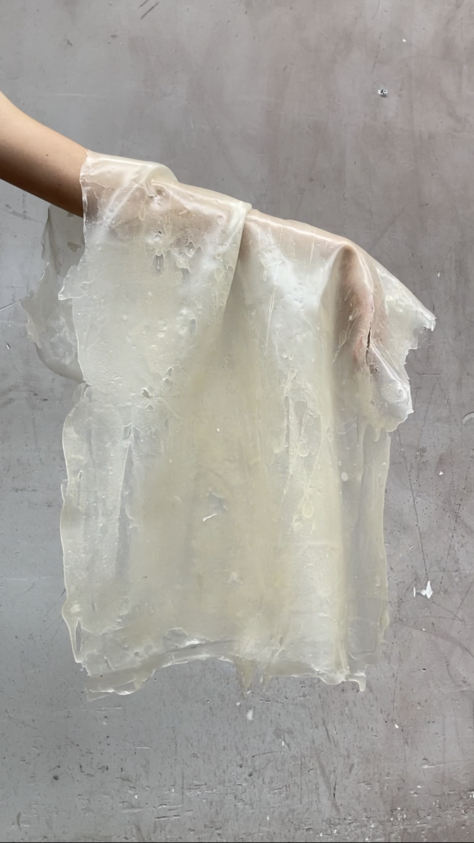 I like the disgust some people have when they see those slimy, slippery structures. It reminds me of the disgust people tend to have with body liquids, although it's natural and a part of us. I have this image in mind of me covering a nude dancer with biomaterials and letting her/him move. For now, it's just an arm moving around with a big piece of starch, agar and glycerine.