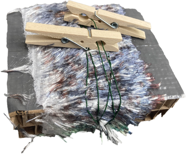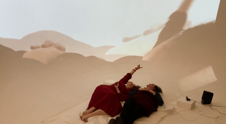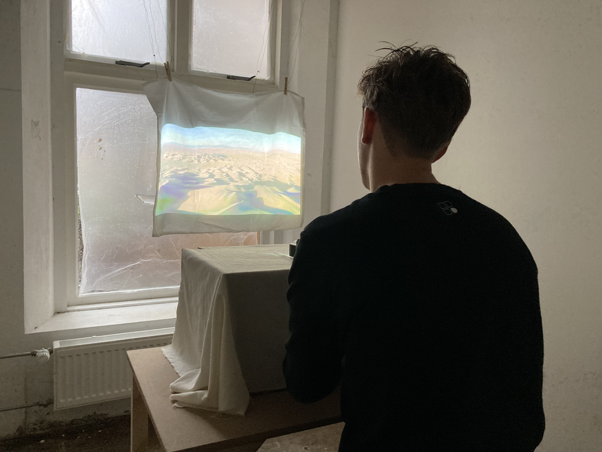 It started with a piece of fabric that I hardened with textile glue. The resulting structure with it's convex and concave shapes reminded me of dunes. I decided to play with that imagination and projected a video of a dune landscape while the specator had to put their hands in a covered box that contained the hardened fabric. While watching the video, the specator touched the unfamiliar piece.