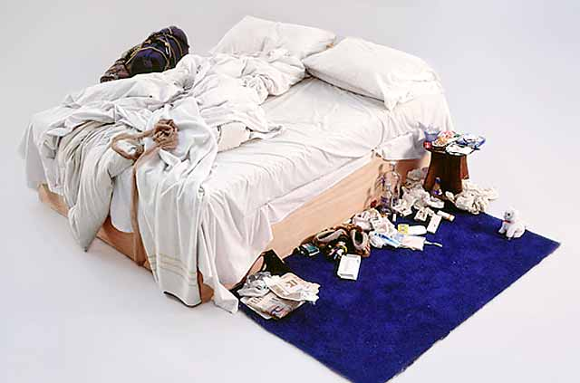 The idea for My Bed was inspired by a sexual yet depressive phase in the artist's life when she had remained in bed for four days without eating or drinking anything but alcohol.When she looked at the vile, repulsive mess that had accumulated in her room, she suddenly realised what she had created. Emin ardently defended My Bed against critics who treated it as a farce and claimed that anyone could exhibit an unmade bed. To these claims the artist retorted, Well they didn`t, did they?" No one had ever done that before."