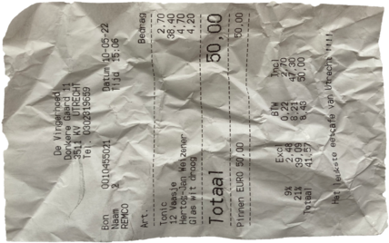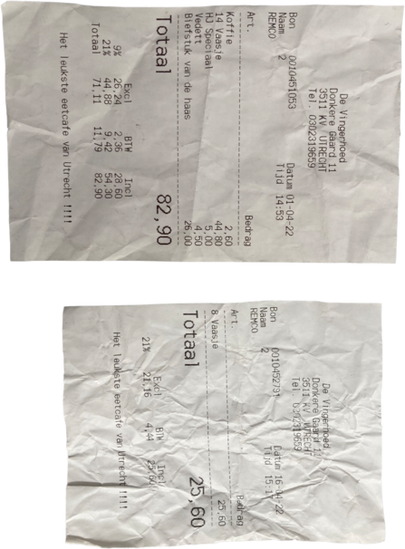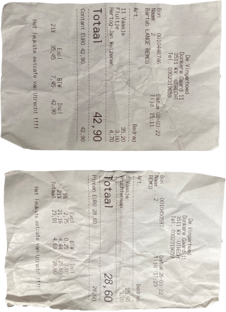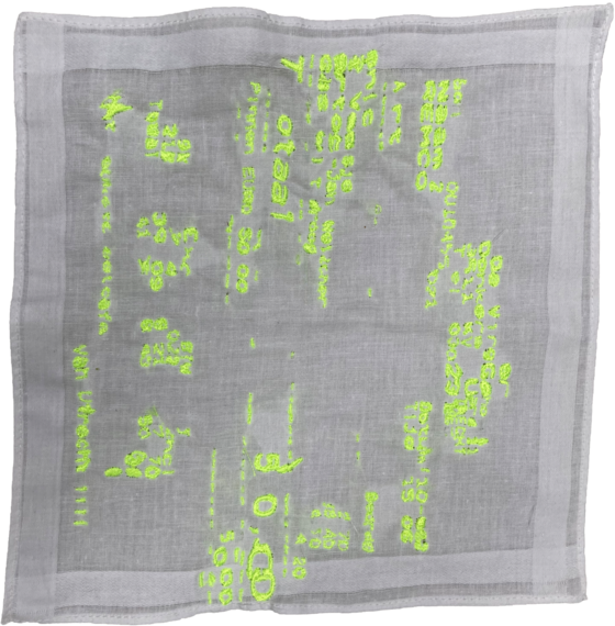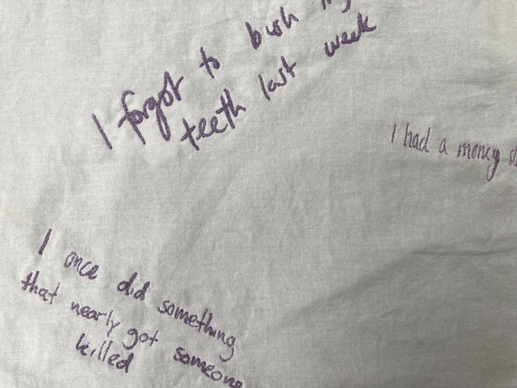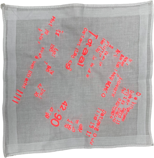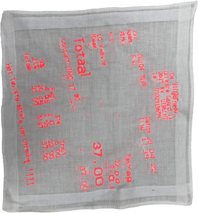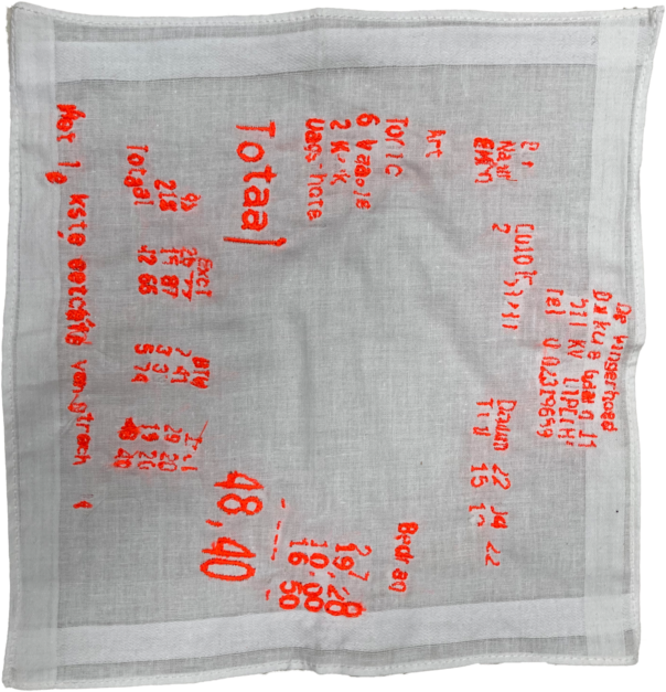 I saw a parralell between the shared secrets and the receipts of R. Both are things we want to hide. We want to hide our secrets from the world as much as we would like to hide the trace of our drinking habits. Now I'm the owner of those proofs. I call them receits of vulnerbility. So what to do with them? By embroidering those documents, I made those things poeple normally would like to hide permanent. If we look back to the embroidery history, it used to be an ancient craft that first had a practical purpose of repairing clothing. I know that embroidering something we would rather like to hide will not repair this issue, but I think the first step to get rid of something that makes us vulenerbale and uncomftable, is to make it visible and not to hide it. Own it.