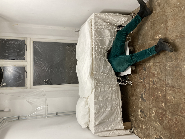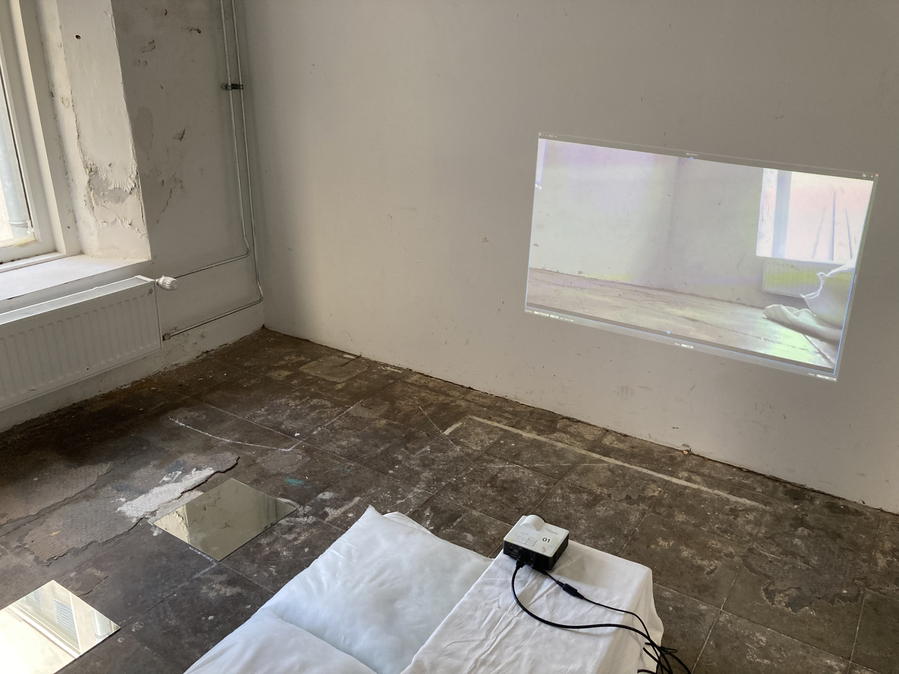 This experiment includes two steps. First, spectators had to go one-on-one in an almost empty room. All they could see was a sheet lying on the floor, a beamer, a webcam and a live projection of the sheet from an angle above. The spectators realised that once they lay on the sheets, they could see their bodies, projected in front of them from an odd angle. The spectators were left in the room with nothing but themselves.