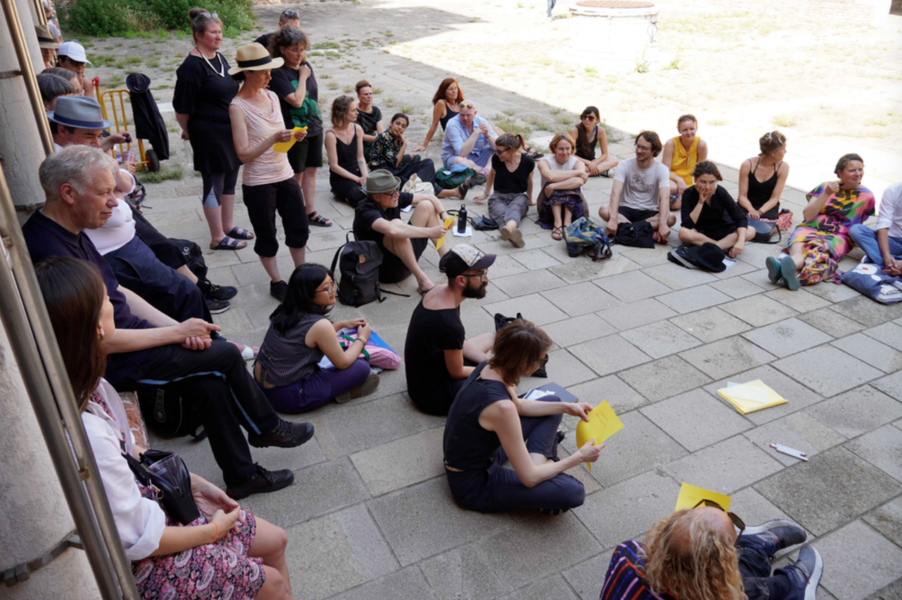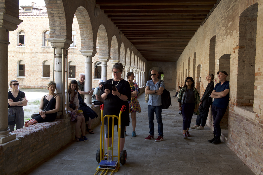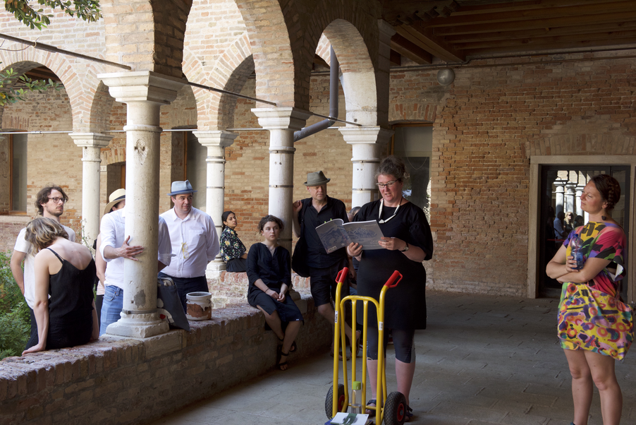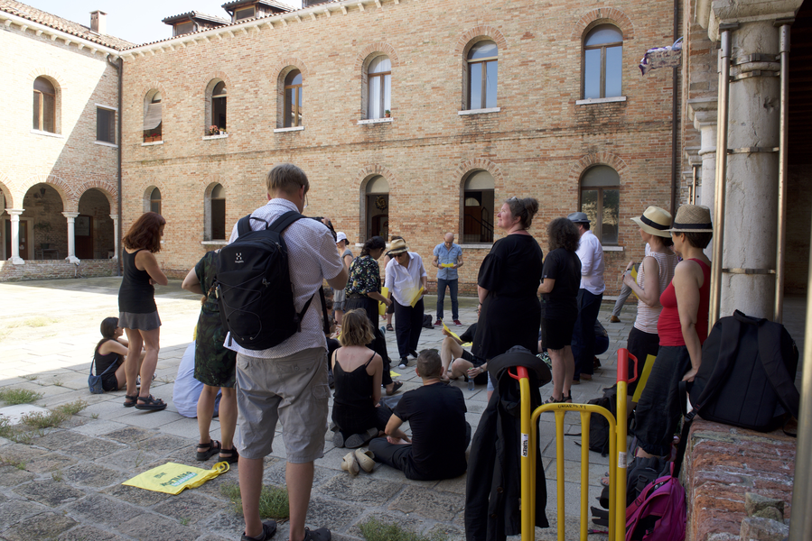 Drawing on their contribution to the No Telos! publication, Andrew Brown and Katja Hock guided participants on a blind walk through Guidecca, designed to overturn the predominantly visual experience of Venice, providing an opportunity to individually explore through body language the apparently contradictory states of togetherness and solitude, being guided and feeling lost. The exercise offered participants a liminoid space in which the real-world consequences of being lost are side-stepped.