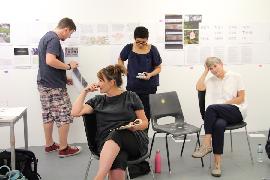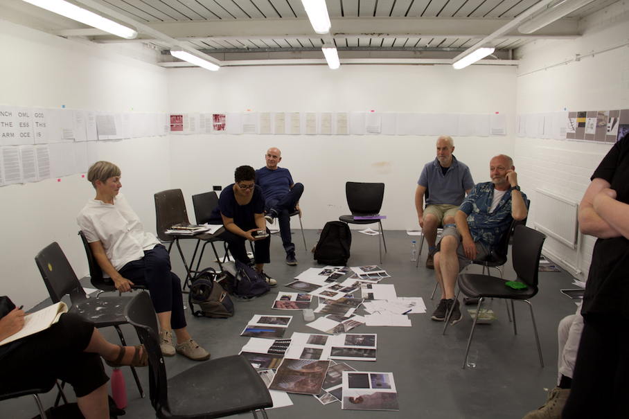 During Summer Lodge 2018, No Telos! researchers came together geographically in the fine art studios at Nottingham Trent University to explore how to translate and communicate the experiential dimension of their shared research in Venice (2017) into publication form, working together live in a physical space for testing the relations between individual contributions and the unfolding logic of the whole. Individuals were invited to bring in a hard copy of their initial plans/thoughts for the publication and share these various sketches, diagrams, drafts and proposals by displaying them on the studio wall. The group were joined by designers Joff+Ollie who further supported the organisation and design concept of the publication.