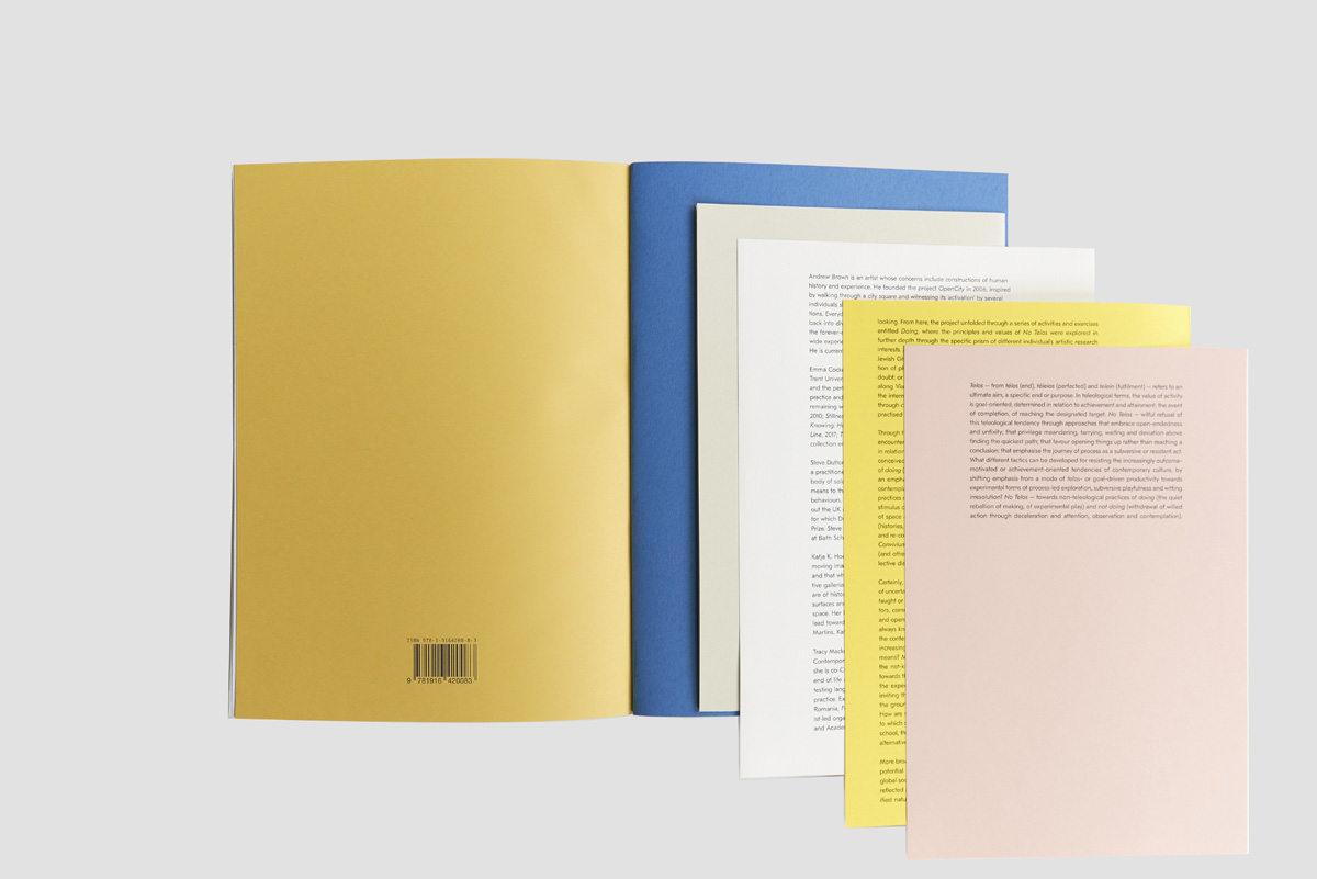 No Telos is a collaborative artistic research project for exploring the critical role of uncertainty, disorientation, not knowing and open-ended activity within creative practice and during uncertain times. This artists’ book comprises a series of ‘scores’ drawing on exercises and practices first developed and tested in Venice (2017), where the city is approached as a working ground or live laboratory for artistic research and aesthetic investigation, for poetic inscription and playful experimentation. Contributing artists: Andrew Brown | Emma Cocker | Steve Dutton | Katja Hock | Tracy Mackenna | Danica Maier | Andy Pepper | Elle Reynolds | Derek Sprawson.