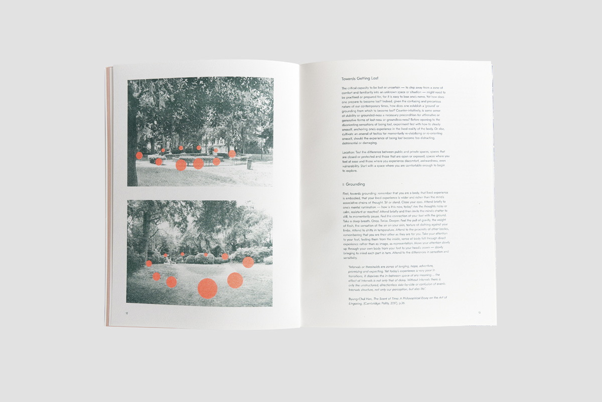This artists’ book comprises a series of ‘scores’, drawing on exercises and practices first developed and tested in Venice (2017), where the city is approached as a working ground or live laboratory for artistic research and aesthetic investigation, for poetic inscription and playful experimentation. The intent is not to just document or archive what was or has been, but rather that these various scores might operate as a speculative tool-kit that can be shared with others for future use or activation, in other situations and at other times. Edited by Emma Cocker and Danica Maier. With contributions from Andrew Brown, Emma Cocker, Steve Dutton, Katja Hock, Tracy Mackenna, Danica Maier, Andy Pepper, Elle Reynolds, and Derek Sprawson.