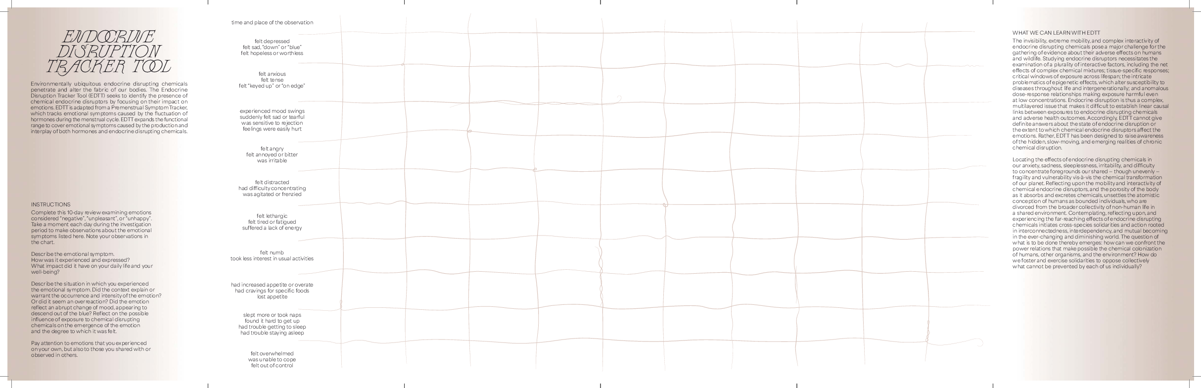 Our bodies are porous entities that interconnect with and depend on the broader collectivity of human and nonhuman life that exists within a shared environment. Using the figuration of synthetic bodies, this exposition aims to examine the relationships in which we are enmeshed as our bodies absorb and excrete chemicals. With a focus on involuntary exposure to industrially manufactured chemicals (as opposed to exposure to naturally occurring chemicals or voluntary experimentation with chemicals of all types), this exposition invites readers to learn about the chemicals to which we are exposed and by which we are affected. With the ubiquity of chemicals in the environment, who are we becoming? How do chemicals affect us and how do we interact with them? How can we live well with chemicals in spite of their potential to harm? Adopting a decolonial feminist, posthumanist, and new materialist approach and embracing queer ecological sensibilities, this exposition develops protocols for embodied and materially embedded research practices that trace the effects of exposure to chemicals in everyday life. In so doing, it aims to demonstrate how we might build resilience through encounters with toxicity, contamination, and impurity. Download Accessible PDF