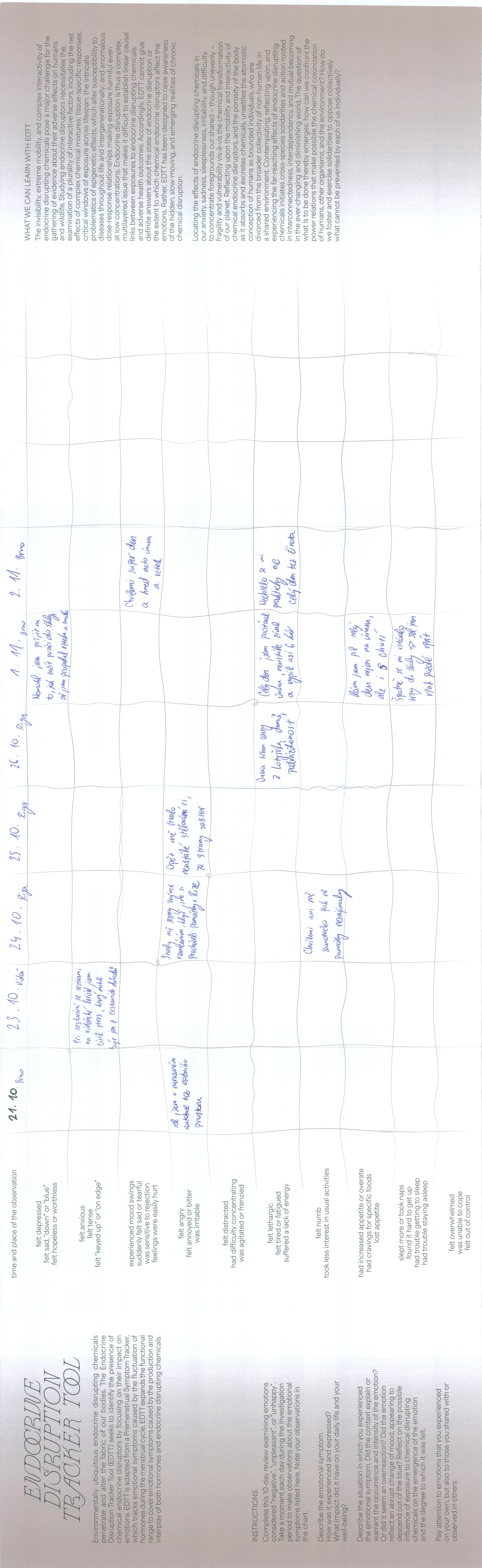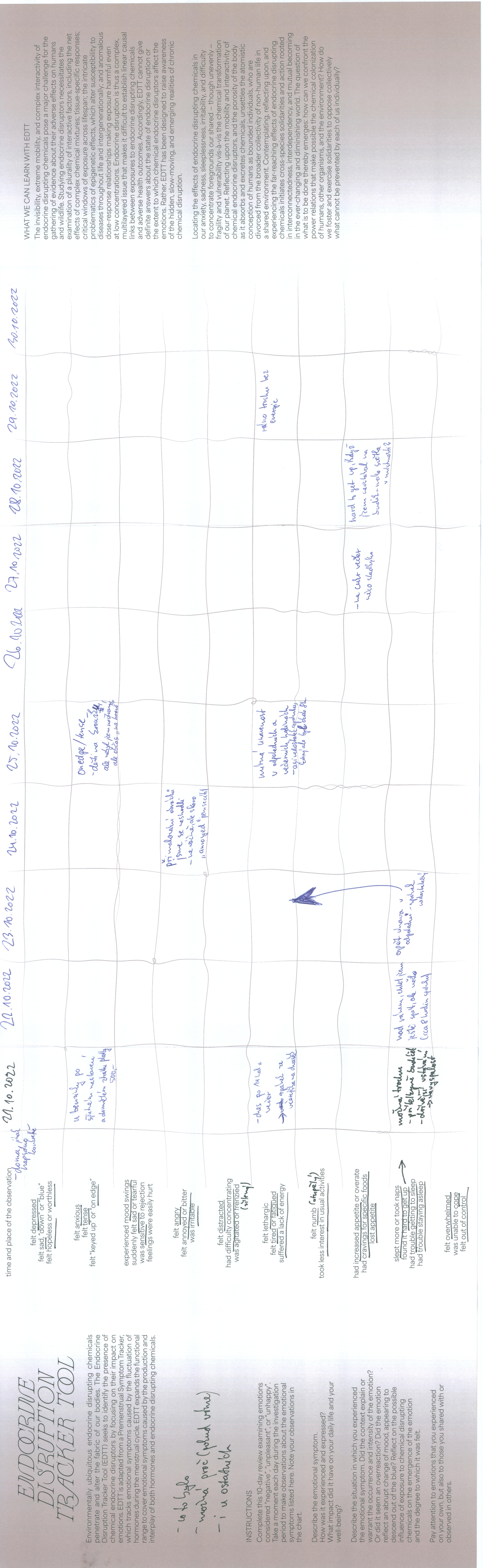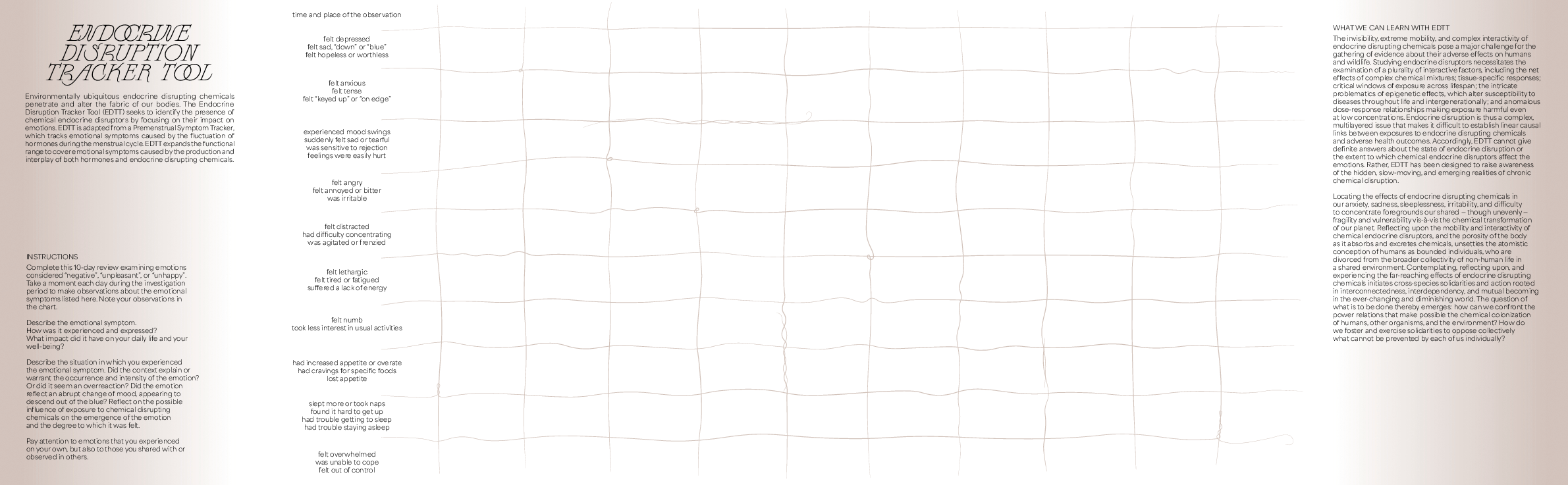 The EDTT is not designed to provide conclusive answers about endocrine disruption. Instead, it aims to raise awareness of our entanglement with global infrastructures of human-made chemicals. By locating the effects of endocrine disruption in our anxiety, sadness, sleeplessness, irritability, and inability