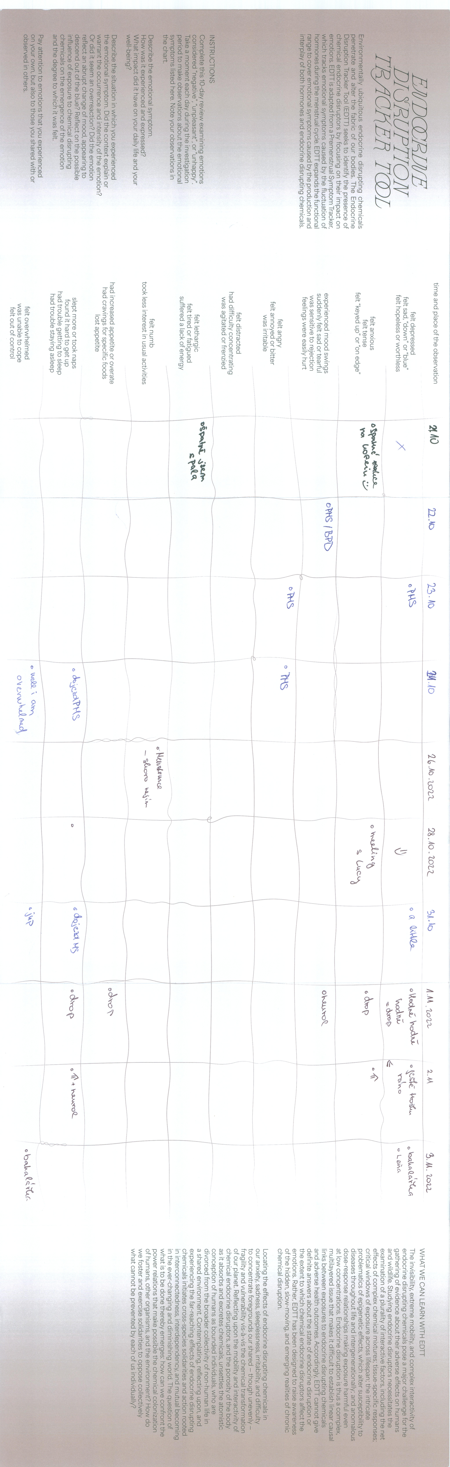 The EDTT is not designed to provide conclusive answers about endocrine disruption. Instead, it aims to raise awareness of our entanglement with global infrastructures of human-made chemicals. By locating the effects of endocrine disruption in our anxiety, sadness, sleeplessness, irritability, and inability