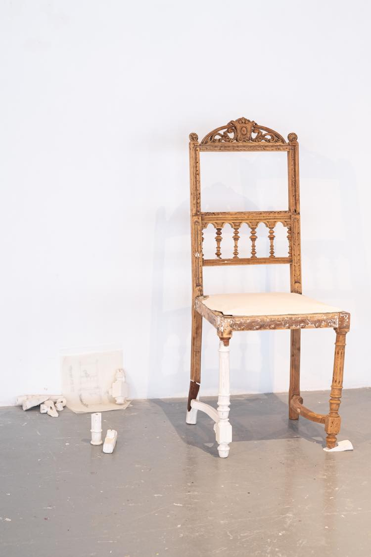 Une chaise antique récupérée dans le quartier entre dans ma vie alors que mon système immunitaire affaiblit par la chimiothérapie m’empêche de trop sortir de la maison. J’en prends soin, j’enlève son vernis âgé, et je la répare avec du plâtre. L’utilisation de techniques empruntées à la sculpture change la forme et la fonction de l’objet, à la manière d’une restauration dynamique (Sennett, 2008). Les traces visibles de mes interventions, du temps, et des techniques non conventionnelles font émerger la charge affective de l’objet qui a aussi su prendre soin de moi.