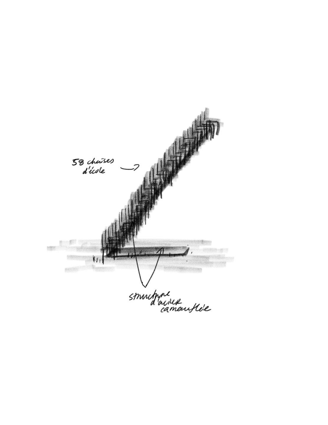 L’automne dernier, j’ai pris possession de 130 chaises d’école en bois et en métal, elles que j’ai transportées affectueusement et trop souvent avec moi entre l’église ou je les ai ramassées, l’atelier de fabrication de meuble où je les entreposais, et maintenant chez moi. Une fois récupérés, les meubles jetés deviennent un problème qui doit outrepasser la responsabilité personnelle et devenir un enjeu pour la société et les institutions publiques. Je ne sais pas quoi en faire. Mon projet actuel consiste à trouver différentes façons de réintroduire ces chaises dans l’économie, morale ou économique, tout en représentant la matérialité du problème éthique dont nous sommes tous responsables.