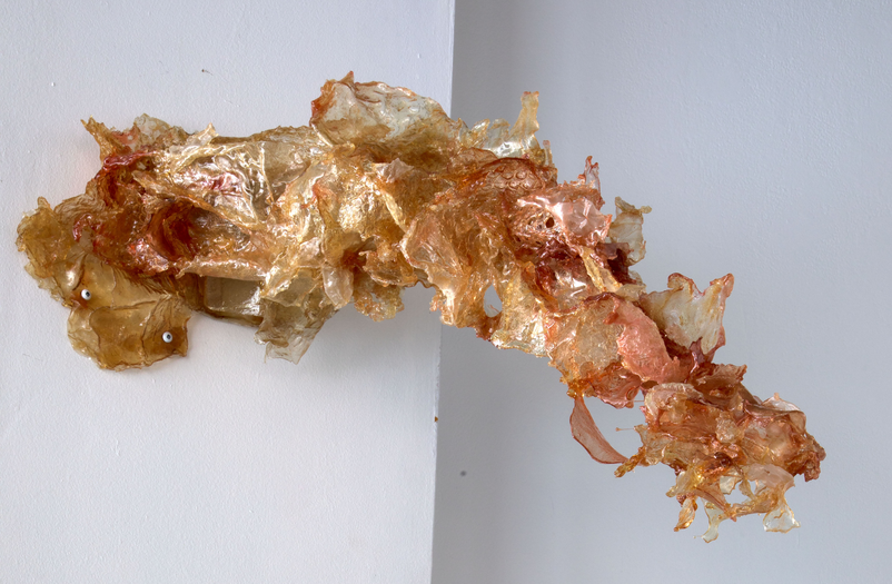 J'ai découvert des qualités du bioplastique qui ont transformé ma pratique. Des techniques de travail se sont imposées tels que l’accumulation de fragments, le travail en suspension et le geste de nouer. Tranquillement, il s’est opéré un transfert dans lequel l’interprétation du sujet n’est plus dans la représentation, mais dans un faire permettant l’émergence des formes. S’ensuit un effacement des frontières entre processus et sujet, entre technique et représentation.