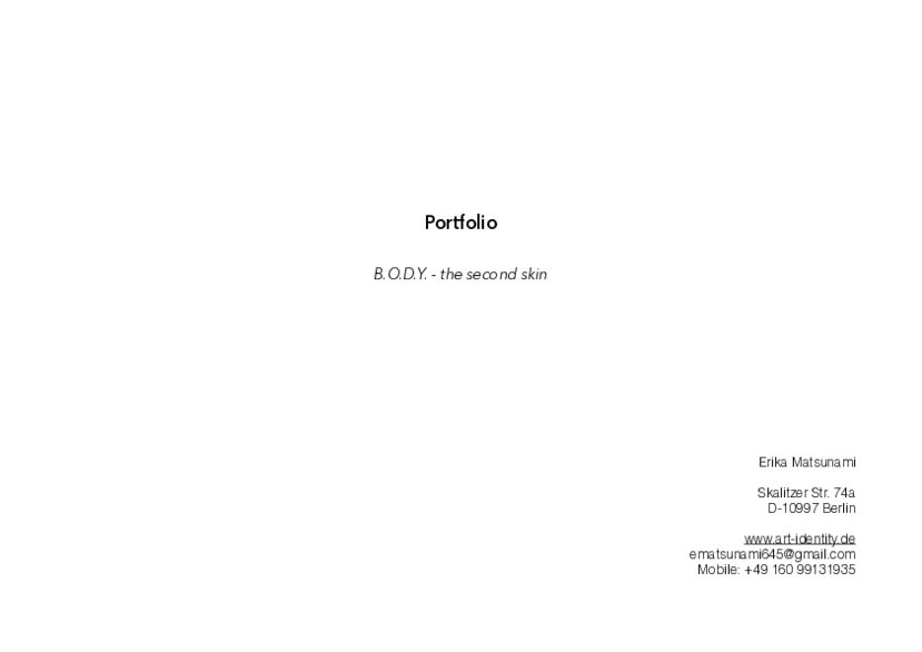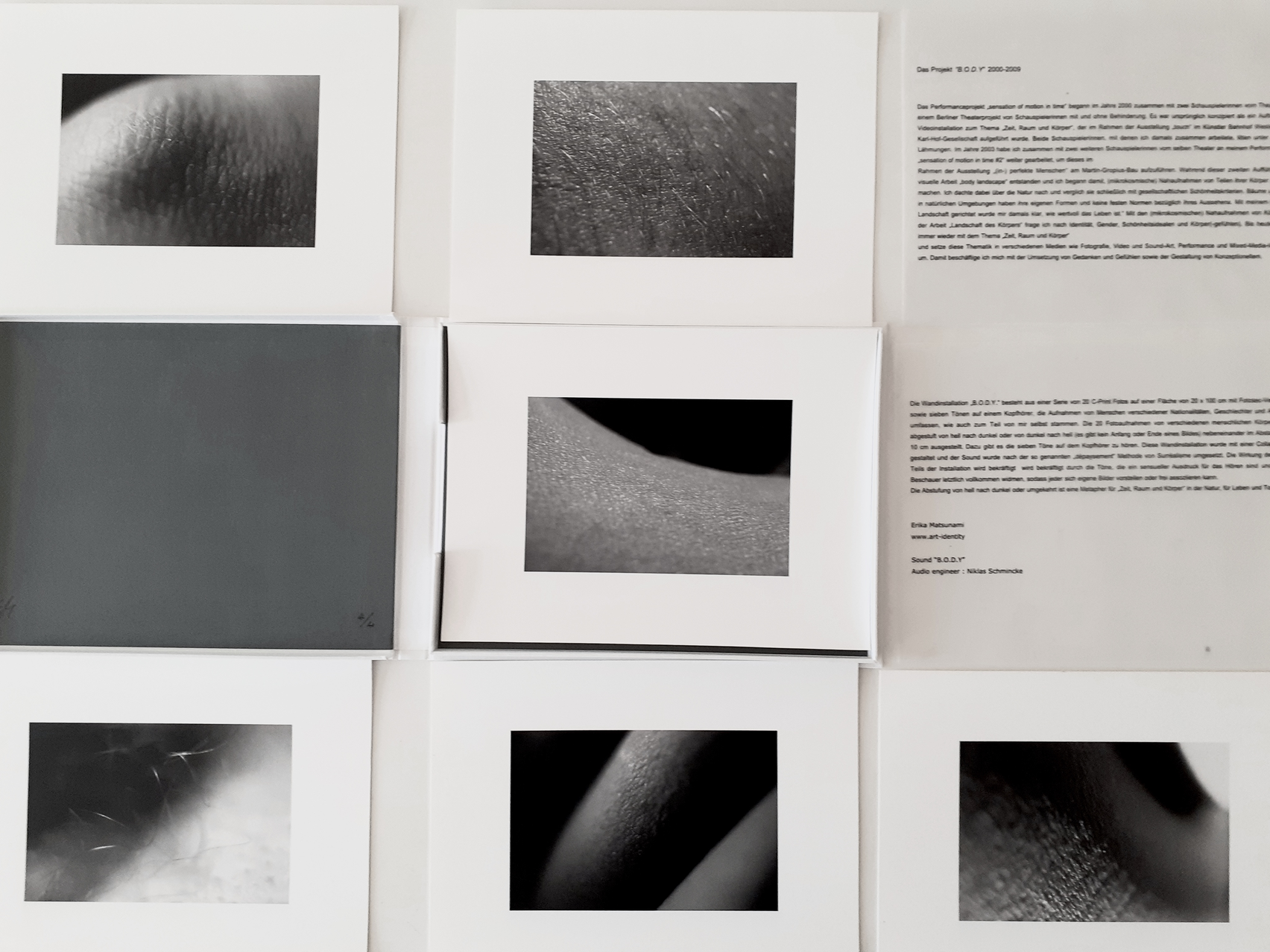 Portfolio B.O.D.Y. (2003–2009) Limited Edition 4/4 (archiving) White and Blue-gay Embossing (+ artist proof, Black and Sliver Embossing), embossing on linen, 25,5 x 19, 5 cm, S/W Analogue photography,12 photographs, Text: Das Projekt "B.O.D.Y. 2000-2009, Erika Matsunami; Review: So Close, So Far, On the installation B.O.D.Y. (2009) by Erika Matsunami, Dr. Miya Yoshida /art historian and curator, Berlin, 2009