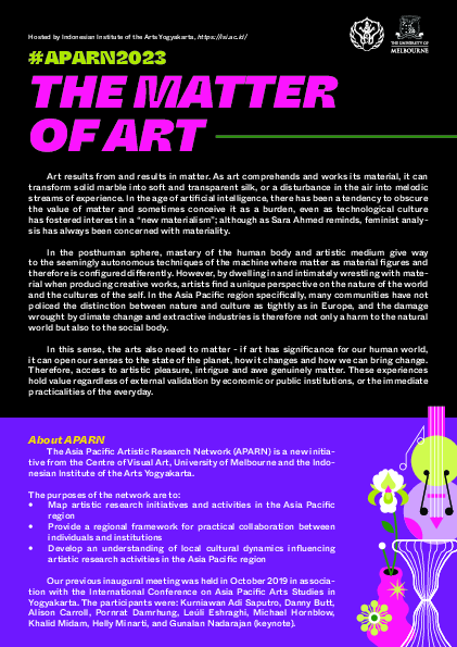 My research practice uses strategies of dispersal and echo to contextualise the complex relationships between contemporary visual production and the social, political, and capital relations that form its materiality. I draw from readings of Johanna Drucker’s three modes of materialist engagement (Forensic, Distributed and Performative, 2010), and Karen Barad’s ideas of diffraction (2007) to isolate a particular perspective within new materialist theory, performative materialism. This will be contextualised in the paper through a discussion of the work of Kamilaroi artist Archie Moore and my own practice to consider materiality as thing- ness and cultural matter – where both are embedded osmotically. Using a feminist political lens, the inter-relational dependencies and systems of exchange between bodies – matter and institutions are activated into the matter of art making itself.