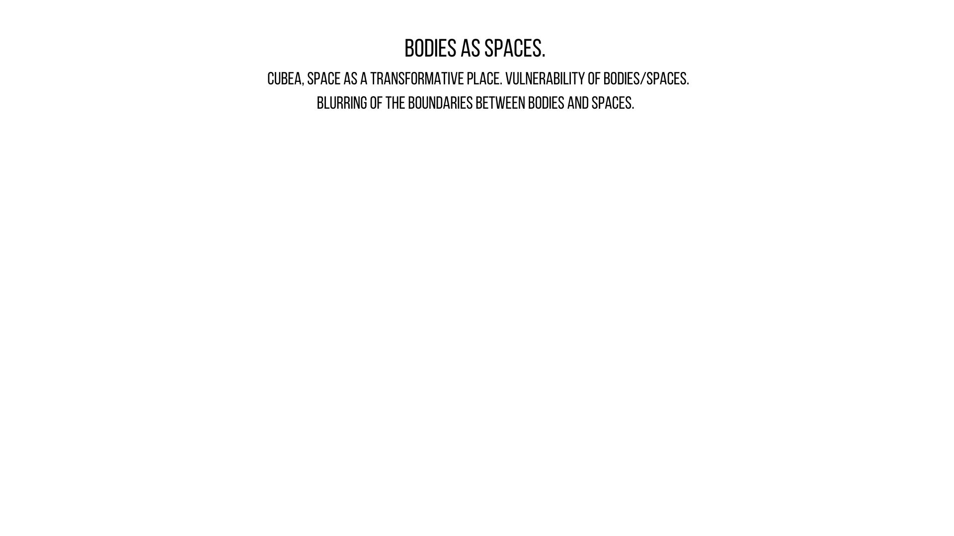 Bodies as spaces: method by which space and body become one. The body embodies space, space embodies the body. The body creates space, space creates body. This method is an ensemble of the previous four. Through them we can come to develop the potential of interconnectedness.