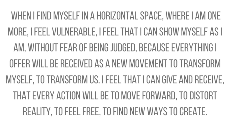 Horizontality as a multidimensional space- breaking hierarchies, the dichotomy: This concept arises to create spaces where the research between bodies is equal, so there will be no hierarchies or differences between bodies, but everyone will be on the same level. Besides being a multidimensional space, where there are different planes to occupy space. That is, there are different planes for inhabiting space, and a single level of equality.
