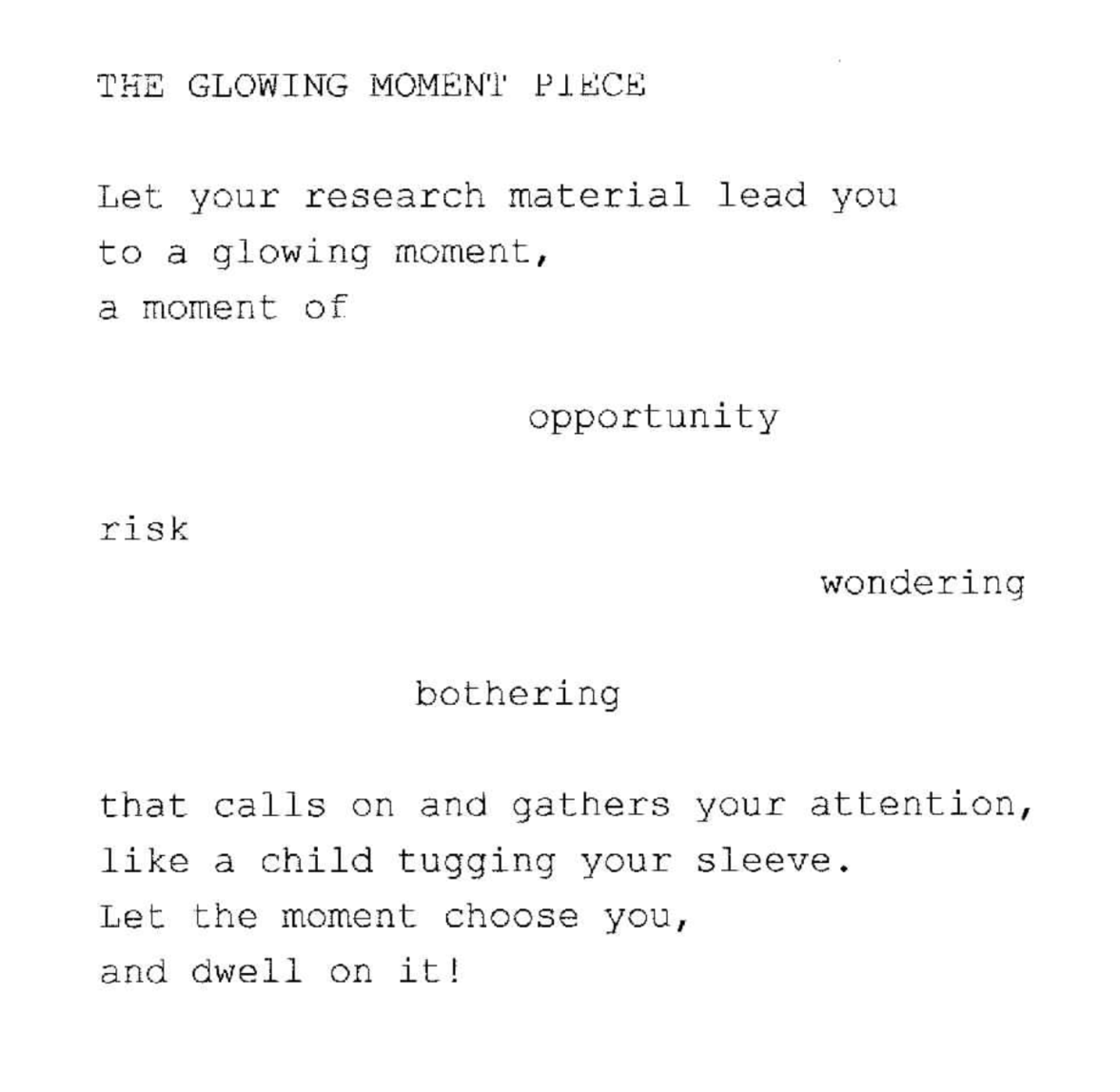 When I started working my way through the recorded research material, I was guided by the GLOWING MOMENT PIECE as a way to open up to unexpected readings of and listenings to the research material, letting the constitutive force of the research material work upon me, allowing it to lead me towards glowing moments.