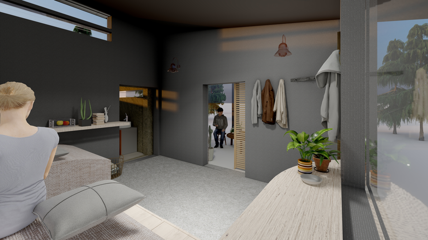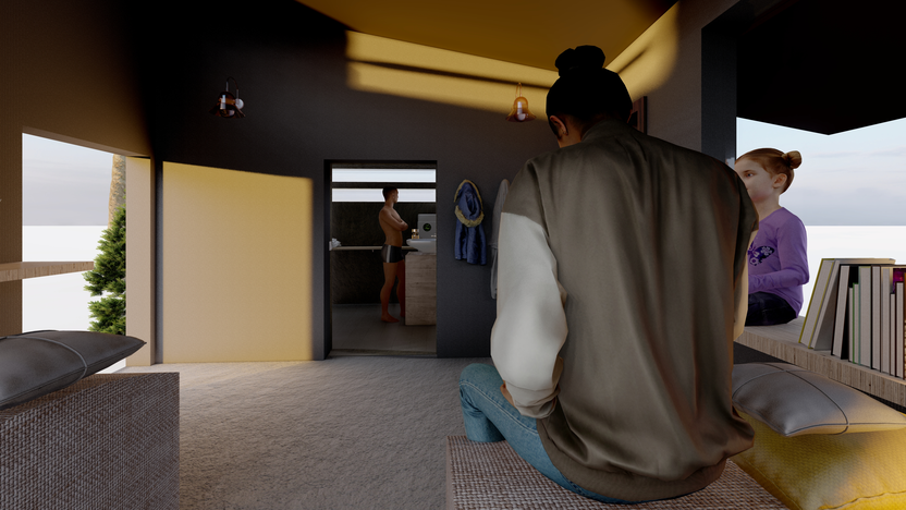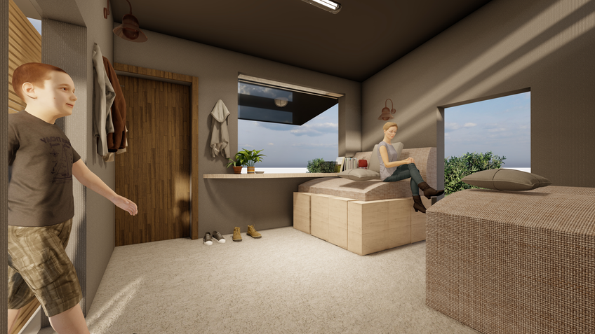 The "bed function box" is the essential part of the project, providing the homeless with fundamental sleep and rest functions. It includes some shape-shifting furniture, such as multi-purpose seats. It can be turned into a bed when the homeless need to sleep.